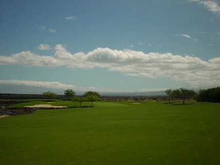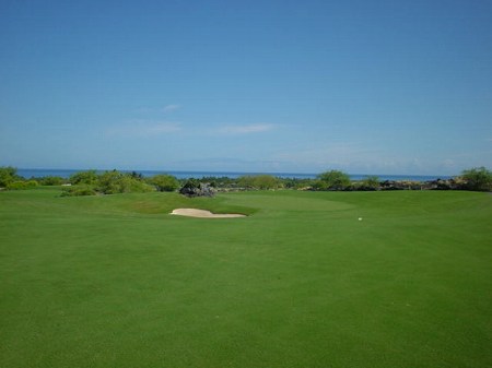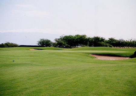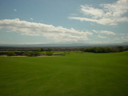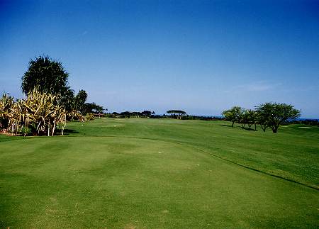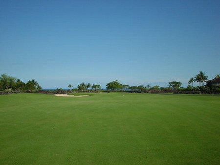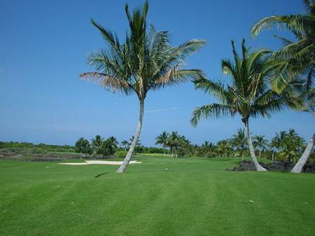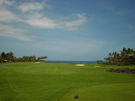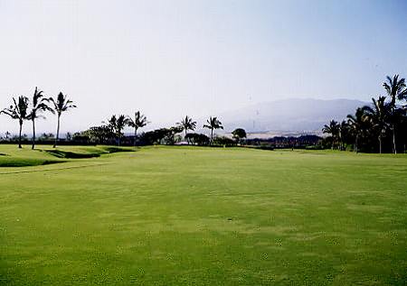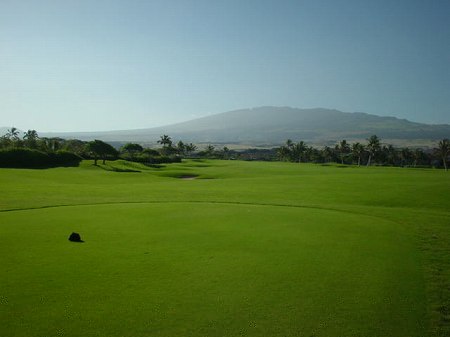 ![]() 1番ホールは、マウナケアへ向かってティーショットするスターティーングホール。 やや左へドッグレッグしているパー4です。 左サイドには、グリーン近くまで、クロスバンカーが点在していますが、非常に幅が広いので、それほど気になりません。 ![]() バミューダグラスのフェアウェイは、ディボットが全くなく、フカフカしていて、完璧なコンディション。 グリーンの近くには、ココナッツツリーがあり、ハワイのコースらしい雰囲気があります。 非常に気持ちよくスタートできるホールといえます!(^^