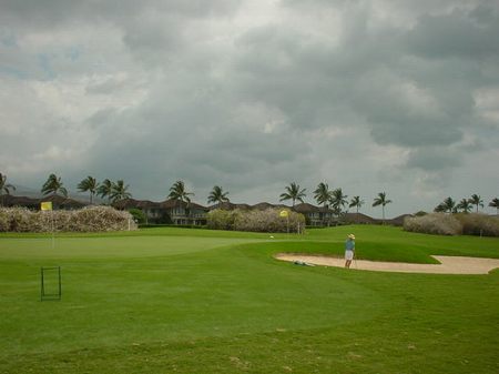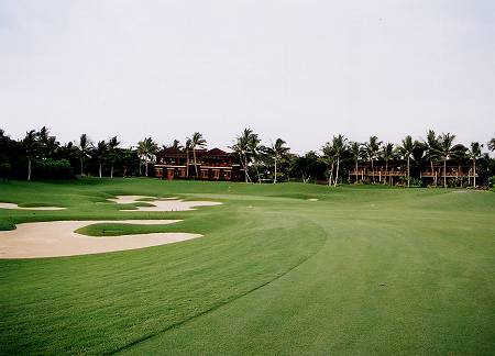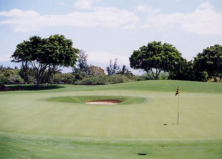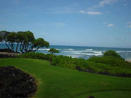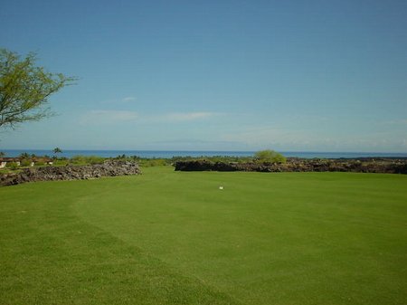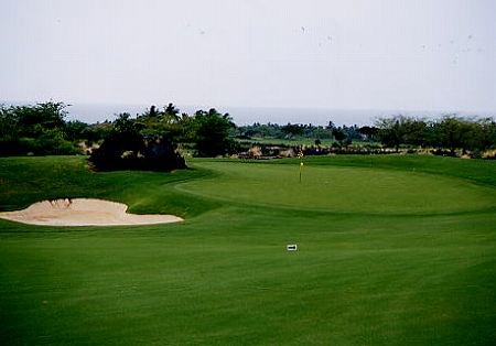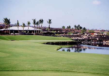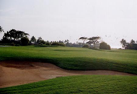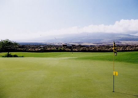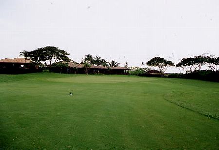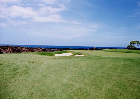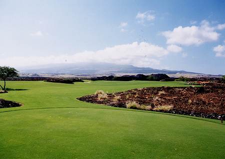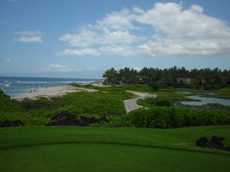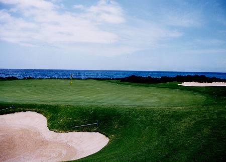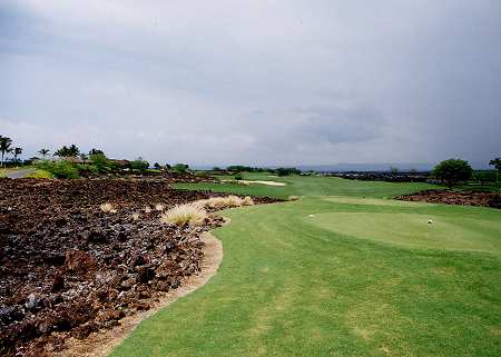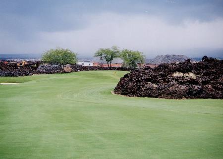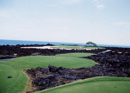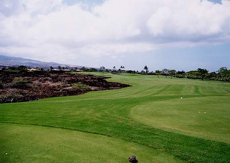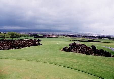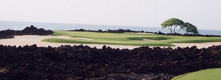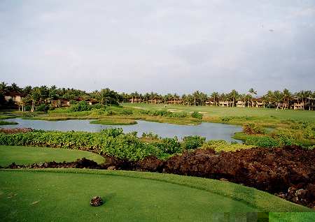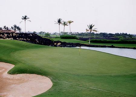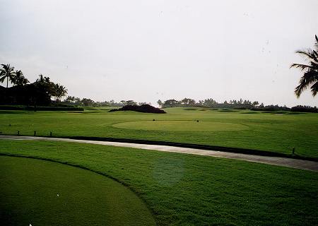 1997年9月29日にラウンドしました(1回目)。 今年オープンした、フォーシーズンズリゾートフアラライにあるNEWコース。 ここは、マウナ・ラニリゾートと同様のラバ・デザートコースで、最高のコースでした。 メンテナンスが完璧。おそらくHAWAIIで1番ではないかと思います。 (全コースラウンドしたわけではありませんが・・(^^;)) メンテナンスは、マウナラニも最高ですが、おそらくそれ以上。 グリーンもマウナラニよりも速く、ボールマーク、ディポットもほとんどありませんでした。 (すいているせいもあるかな?) レイアウトは、溶岩の中に各ホールがありますが、 マウナラニのコースのより、全然幅が広いので、多少、左右にボールがぶれても、 溶岩(1ぺナ)までは行きません。 海越えのホールはありませんが、17番は、海に隣接していて、最高の景観。 また、12番は、グリーンの中にバンカーがある、おもしろいホールです。 7番ロングは、フェアウエイの途中に、両側が溶岩の壁(高さ5mくらい)がせまっていて、 フェアウエイの幅は15yくらい。その間をとおすか、上を越えていくかを選択させられます。 ティーショットの飛距離が足りないと、セカンドは壁の手前に1回きざむ必要があります。 グリーンは速く、芝目は気にすることはないでしょう。ベントの感覚でOK。 アンジュレーションはマウンドとかがない分、ラインはそんなに 難しくないと思います(スネークラインとかがないという意味で、傾斜はある)。 距離感が重要。特に下りのラインは速いです。 難易度は、要所のバンカーに入れないことと、速いグリーンに対処できれば(速いベントに慣れていれば、平気だと思う)、幅が広い(1ぺナにならない)ので、 比較的やさしいと思います。 コース内の樹木は少な目で、遠くの景色までよく見渡せます。 景観としては、まだ、ホテル(コテージ風)の建物を建築中のところ、 整地してるところなどがあって、現時点では今一のところも・・。 超おすすめコースですが、 現在はフォーシーズンズリゾートのオーナー(別荘の保有者)と、ゲスト(ホテル宿泊者) しかプレーできません。そのせいか、非常に空いていて、貸し切り気分でした! またラウンドしたいコースですが、宿泊しないとプレーできないのでは・・・ ちょっと考えちゃうかな? 距離は、Mua:5374y、Regular:6032y、Chanpionship:6632y、Mahope:7117y。 料金は、$105でした。 リプレイ(2ラウンド目)は、$55。 総合評価(HAWAIIコースとしての私のランク(特A、A、B、C、D、Eの6段階)):A (宿泊しないとプレーできない事(費用が高くついてしまう)と、建築中の建造物の景観 がマイナスポイント) ここで、ゴルフするために、フォーシーズンズホテルフアラライに1泊しました。 料金は1泊ツインルーム(ゴルフビュー)$370(朝食 or レンタカー付き)と激高ですが、 ホテルスタッフは常時、日本語スタッフを配備し、従業員の応対、サービスは、いきとどいていて、驚きました。部屋もゆったりしていて、すばらしかったです。 (でも私はコンドの方が広くて好きですが・・・)