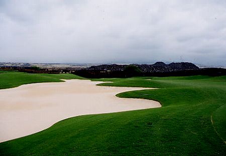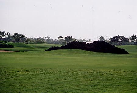 ![]() このホールも印象に残るホールの1つ。 やや左ドッグしているパー4です。 右サイドには、クロスバンカー群、左にもクロスバンカーがあります。 ![]() おもしろいのは、フェアウェイの左に、巨大な”溶岩の小山”が立ちはだかっているのです!(^^ 左ドッグレッグのホールですので、最短ルート狙うのであれば、ティーショットは、この”溶岩の小山”越え!! ![]() ←セカンドショット地点付近、左サイドからグリーンを見たところ。