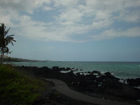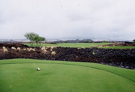 ![]() シグネチャーホールの1つ。 フアラライゴルフクラブで、いちばん海に近いところにあり、いちばん美しいホールといえます。(^^ それぞれのティーグランド、また、グリーンのまわりは、すっぽりと溶岩に囲まれています。 溶岩の色が真っ黒で、芝の緑色、真っ白なバンカー、そして、グリーンのすぐ奥に水色の海が広がり、色彩のコントラストが美しく、最高に素晴らしい見事なホールです!(^^ ![]() ![]() ホールは、海岸線に沿ってレイアウトされているので、ティーグランドの左側も海です。 ←ティーグランドから見た海。 この写真撮影時は雲がかかっていて、あまりきれいに撮れてませんが、海は最高にきれいです! ![]() グリーンの手前には、少しフェアウェイがあり、巨大バンカーが取り囲んでいます。 また、グリーンの右手前と右奥にもバンカー。 ![]() 17番ホールのグリーン奥は、すぐ海で、最高の景観!(^^ ただ、フアラライゴルフクラブには、”海越えホール” がないというのは、残念です!(^^; ”海越えホール” さえあれば、完璧なのですが・・・。 ![]() ←グリーンの奥から海を見たところ。 この写真も、曇っていたため、きれいに撮影されてませんが、太陽がでてると、最高にきれいですよ!(^^
