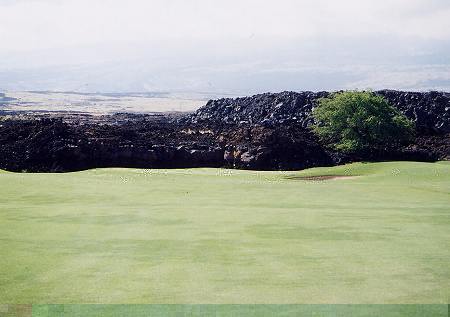 ![]() 非常に距離の長いパー3。 ”Championship Tee” からは、217ヤードあります。 ティーグランドが少し高いところにあり、やや打ち下ろし。 遠くに海が見え、気持ちいいです!(^^ ホールのまわりは、溶岩エリア。 グリーンの左手前にはバンカーがあります。 8番ホールのグリーンは、4番ホールグリーンとの”ダブルグリーン”。 4番ホールのグリーンは、バンカーの左奥。 ![]() ←8番ホールグリーンの右サイドから見たところ。 奥に、4番ホールのピンが見えます。