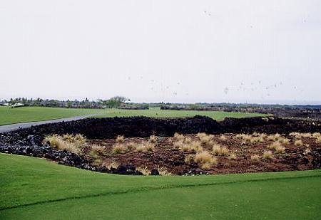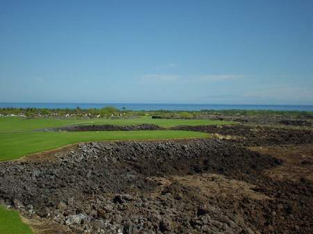 ![]() ホール形状は、ややS字形になっているパー5。 ティーグランドからは、遠くに海が見えます。 ホールの両サイドは”溶岩エリア”ですが、フェアウェイが広いので、それほど気になりません。 左サイドにクロスバンカーがあります。 ![]() ←セカンドショットとサードショットの中間くらいの地点からグリーン方向を見たところ。 この先から、右方向へカープしています。 ![]() グリーンの右手前と左奥にバンカーがあります。 ←サードショット付近から見たグリーン。 ![]() 4番ホールのグリーンは、8番グリーンとのダブルグリーン。 ”ダブルグリーン”は、超巨大な1つのグリーンで、2つのホールのグリーンを共用しているグリーンのこと。 このコースでは、4番と8番ホールのグリーンがつながっていて、1つのグリーンになっているのです。(^^ 1つ↑の写真の右側に8番のグリーンがあります。 ←手前が4番ホールのピン。 奥に見えるのが、8番ホールのピンです。 ![]() 4番ホールと、5番ホールのインターバル。 カートパスが、こんな”溶岩”の間をぬうように造られています。