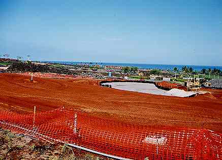 ![]() 広々としたパー5。 ホール形状は、最初にやや右へカーブしていて、そのあと左へカブしている ”逆S字形” になっています。 ![]() ←セカンドショット地点から見たところ。 この先から、ゆるやかに左へカープしています。 左サイドには、バンカーと小さな木、そして溶岩。 ![]() ←サードショット地点付近から見たところ。 グリーンが、やや左にあるので、左サイドからのサードショットは、木越えとなります。