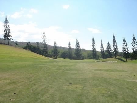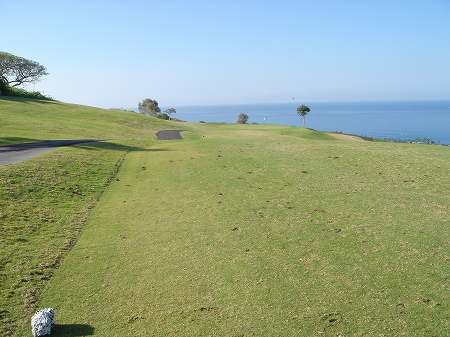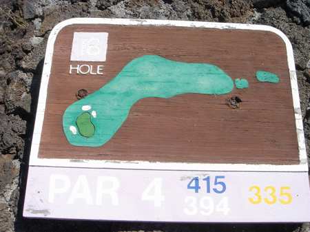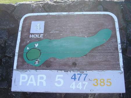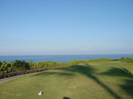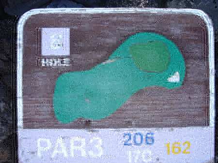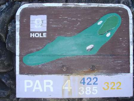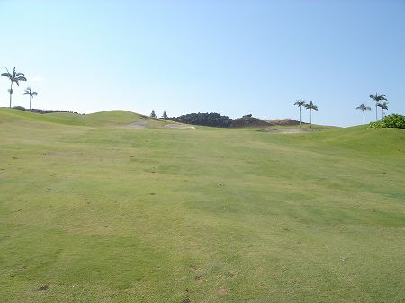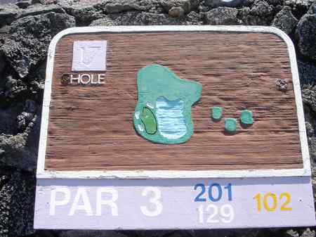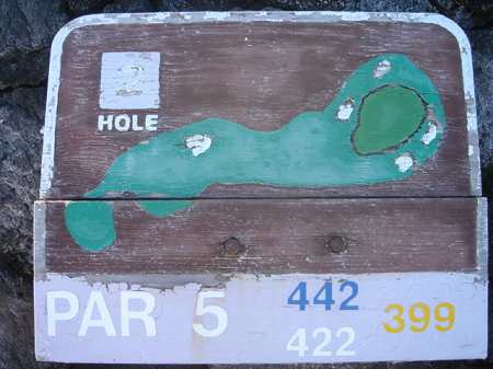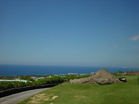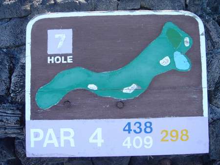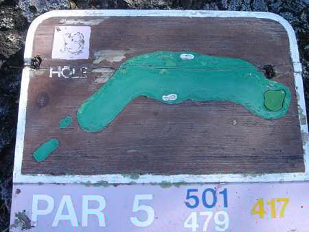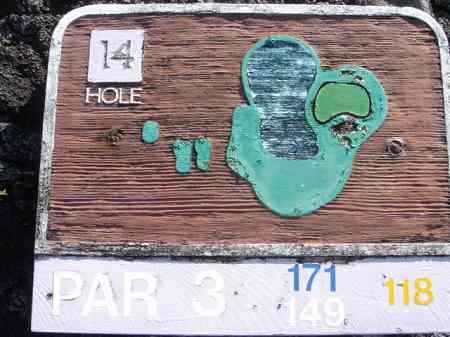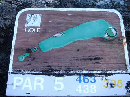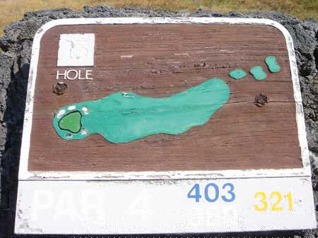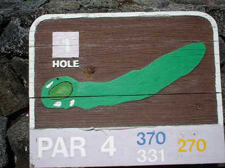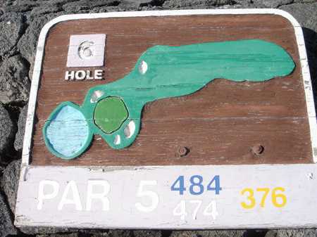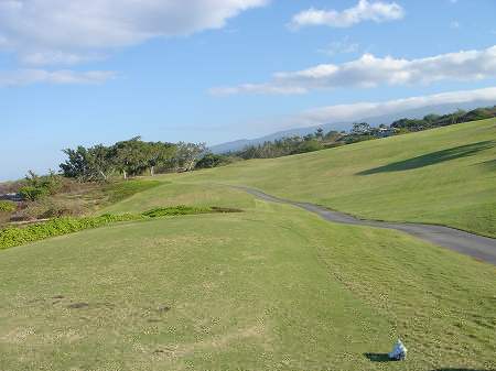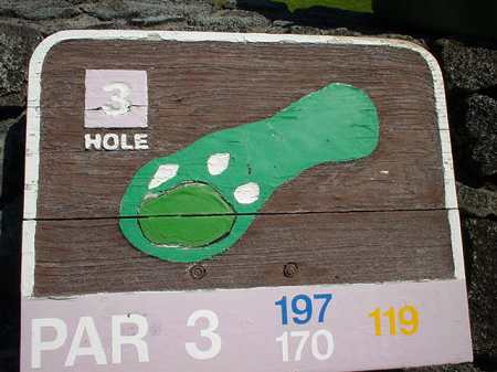 ![]() No.1 Par 4 ■374yard □342yard ■276yard スターティングホールは右にカーブしているパー4。 ティーボックスが少し高くなっているので、ティーショットjはやや打ち下ろしですが、フェアウェイは上り傾斜。 ![]() いきなり幅が非常に狭く見えるホールです! ティーインググランド正面に、花壇というか木々のあるエリアがあり、フェアウェイはその左側。 フェアウェイは、左にある海方向へ傾斜しているので、右から左へと下がるかなりのサイドスロープで、左サイドはOBなのです! ティーマークはモロに正面の花壇エリアを向いていて、非常に立ちづらかったです。(^^; しかし・・・実はこの花壇の上を越えていってもセーフなのですが、はっきりいってわからないです!(^^; ![]() ←ティーボックスの左を見たところ。 こんなに広くなっているのですが、今回のティーを使用時はまったく意味ありません!(^^; 実は、この左後方(写真の左手前)にもティーボックスが1つあり、そこを使用したときは、フェアウェイが広くなるわけ! (そのティーからだとティーショットがストレートなので打ちやすい) ![]() ←ティーボックスの左を見たところ。 高いロケーションにあるので、遠くに海が見えます! ![]() セカンドショット地点付近。 このあたりまで来てみると、実際には幅がけっこう広いです! しかし、ヤーデージブックを見ても、ティーインググランドから見ても、広いということがわかりません!(^^; この先は上りスロープで打ち上げ。 グリーン右手前に木、左右にバンカーがあります。 グリーンは左サイドが特に低くなっている砲台形。 バンカーは左手前と奥に。 ![]() 下りの順目のラインは非常に速かったです! ![]() No.2 Par 5 ■450yard □422yard ■409yard 1番ホールから2番ホールへ行く間のインターバルでは、カートでグイグイと山を上ります! ティーボックスのすぐ前に池があるパー5。 ![]() ストレートですが、池の先右にココナッツツリーとラバ(溶岩)があるので、ちょっと狭く見えます。 ティーショットはやや打ち下ろしで、池越え。 池越えは50ヤードくらいなので、余計なプレッシャーをかけなければ、それほど気にならないと思います。 フォワードティーは写真の左前方にあるので、それほど池がかかりません! 左サイドはラバ&ブッシュエリアですが、右サイドは7番ホールがあり広いので、ココナッツツリーを越えていけば問題ありません! ![]() ←ティーボックスから左前方を見たところ。 かなり山を上ってきたので、1番ホールよりさらに高く、海がよく見えて景色がよいです!(^^ ![]() ←上の写真よりやや左横を見たところ。 ![]() ←ティーボックスの左から海を見たところ。 左横にずーっと海が広がっています!(^^ ![]() セカンドショット地点付近。 この先はアップスロープで、セカンドショットは打ち上げ。 グリーンは見えません! このコースはほどんどが海方向へ傾斜しているので、フェアウェイは右から左へ下がるサイドスロープもあります。 ←写真の右やや上には何やら・・・。 ![]() セカンドショット地点のフェアウェイ(やや右)に、小さなラバ(溶岩)があります! ミドルティーから約230ヤードあたり。 それほど大きくないラバなので、もし、この近くにボールが止まってたらアンラッキーでしょう!(^^; ![]() サードショット地点付近。 この先も打ち上げで、このあたりも、左足上がりでつま先上がりのライとなります。 左右にバンカーがありますが、花道が広いのでほとんど気になりません! ![]() ←グリーンの右上から見たところ。 ここからも海がよく見えます!(^^ このグリーンもスロープがけっこうきつく、マウンドもあります! 芝目もかなり効いていました! ![]() No.3 Par 3 ■197yard □177yard ■124yard ←3番のホールプレートは、はがれていて、ありませんでした!(^^; ![]() ←ちなみに、これは2003年時にあったプレート。 ![]() やや打ち下ろしのパー3。 やや距離は長めなので、コントロールを重視がいいでしょう! グリーンはやや砲台形。 バンカーは3つありますが手前は花道です。 ![]() 左サイドは海がよく見えて景色よいです!(^^ ![]() No.4 Par 5 ■534yard □425yard ■400yard ものすごい傾斜のパー5。 パー5としては距離が短いのですが、傾斜がきついため、ものすごく長く感じるホールです。 形状は、グリーン手前て左に曲がっていますが、それまでストレート。 ![]() ティーショットは超打ち上げ! 左の写真で見るよりも、ものすごい上り傾斜なので、壁に向かって打つような感じです!(^^; さらに、左サイドへ向かって下がる、ものすごいサイドスロープもです。 幅は広いですが、左はブッシュエリアで、かなり右方向ね打っても、ボールは左まで落ちてきます! ![]() ここもティーボックスの左サイドを見ると、海がよく見えます! ![]() セカンドショット地点付近。 まだグリーンがよく見えません! この先、急激なスロープがあり、グリーンは写真の左奥方向にあります。 セカンドショットは右目から攻めた方がいいと思います。 ![]() サードショ