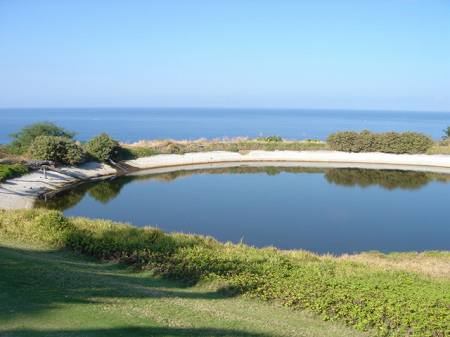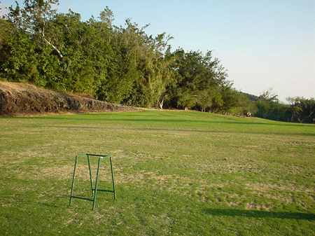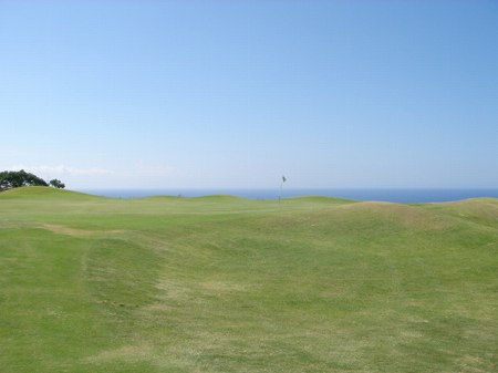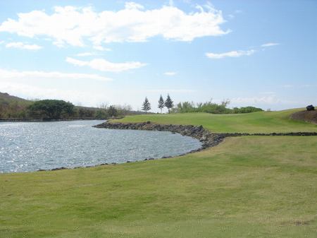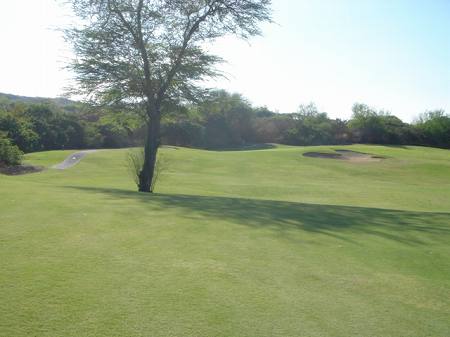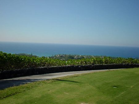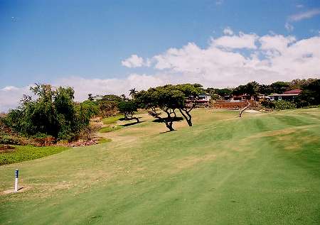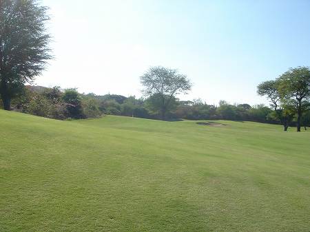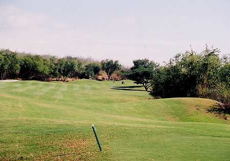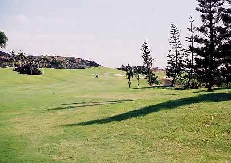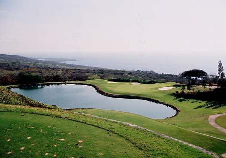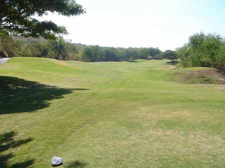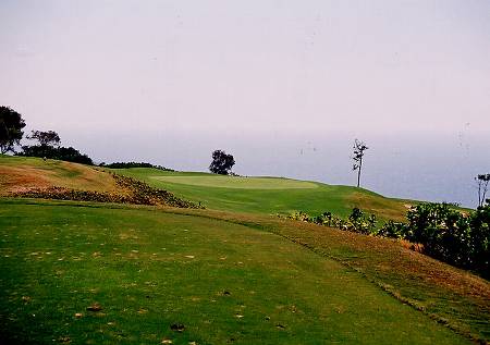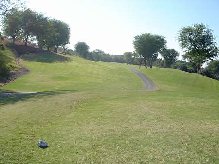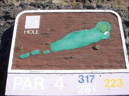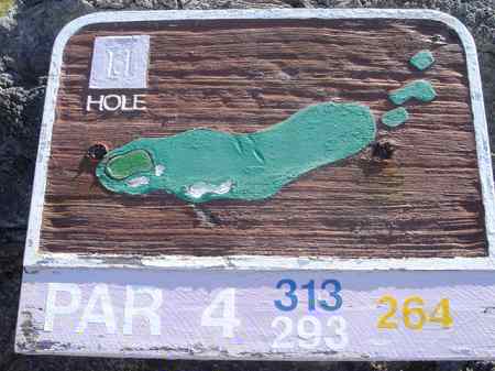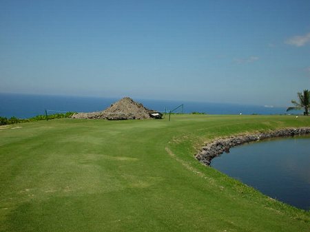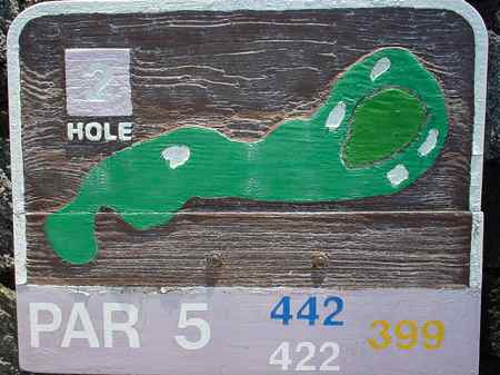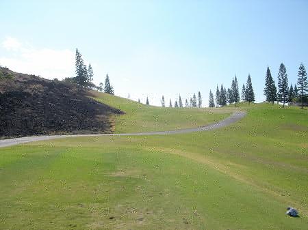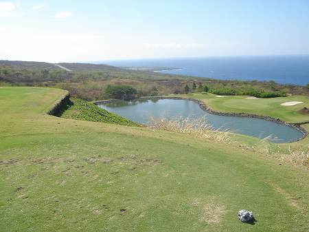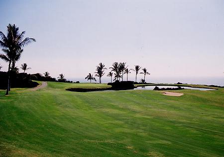 ![]() No.1 Par 4 ■374yard □342yard ■276yard スターティングホールは右にカーブしているパー4。 ティーボックスが少し高くなっているので、ティーショットjはやや打ち下ろしですが、フェアウェイは上り傾斜。 ![]() いきなり幅が非常に狭く見えるホールです! ティーインググランド正面に、花壇というか木々のあるエリアがあり、フェアウェイはその左側。 フェアウェイは、左にある海方向へ傾斜しているので、右から左へと下がるかなりのサイドスロープで、左サイドはOBなのです! ティーマークはモロに正面の花壇エリアを向いていて、非常に立ちづらかったです。(^^; しかし・・・実はこの花壇の上を越えていってもセーフなのですが、はっきりいってわからないです!(^^; ![]() ←ティーボックスの左を見たところ。 こんなに広くなっているのですが、今回のティーを使用時はまったく意味ありません!(^^; 実は、この左後方(写真の左手前)にもティーボックスが1つあり、そこを使用したときは、フェアウェイが広くなるわけ! (そのティーからだとティーショットがストレートなので打ちやすい) ![]() ←ティーボックスの左を見たところ。 高いロケーションにあるので、遠くに海が見えます! ![]() セカンドショット地点付近。 このあたりまで来てみると、実際には幅がけっこう広いです! しかし、ヤーデージブックを見ても、ティーインググランドから見ても、広いということがわかりません!(^^; この先は上りスロープで打ち上げ。 グリーン右手前に木、左右にバンカーがあります。 グリーンは左サイドが特に低くなっている砲台形。 バンカーは左手前と奥に。 ![]() 下りの順目のラインは非常に速かったです! ![]() No.2 Par 5 ■450yard □422yard ■409yard 1番ホールから2番ホールへ行く間のインターバルでは、カートでグイグイと山を上ります! ティーボックスのすぐ前に池があるパー5。 ![]() ストレートですが、池の先右にココナッツツリーとラバ(溶岩)があるので、ちょっと狭く見えます。 ティーショットはやや打ち下ろしで、池越え。 池越えは50ヤードくらいなので、余計なプレッシャーをかけなければ、それほど気にならないと思います。 フォワードティーは写真の左前方にあるので、それほど池がかかりません! 左サイドはラバ&ブッシュエリアですが、右サイドは7番ホールがあり広いので、ココナッツツリーを越えていけば問題ありません! ![]() ←ティーボックスから左前方を見たところ。 かなり山を上ってきたので、1番ホールよりさらに高く、海がよく見えて景色がよいです!(^^ ![]() ←上の写真よりやや左横を見たところ。 ![]() ←ティーボックスの左から海を見たところ。 左横にずーっと海が広がっています!(^^ ![]() セカンドショット地点付近。 この先はアップスロープで、セカンドショットは打ち上げ。 グリーンは見えません! このコースはほどんどが海方向へ傾斜しているので、フェアウェイは右から左へ下がるサイドスロープもあります。 ←写真の右やや上には何やら・・・。 ![]() セカンドショット地点のフェアウェイ(やや右)に、小さなラバ(溶岩)があります! ミドルティーから約230ヤードあたり。 それほど大きくないラバなので、もし、この近くにボールが止まってたらアンラッキーでしょう!(^^; ![]() サードショット地点付近。 この先も打ち上げで、このあたりも、左足上がりでつま先上がりのライとなります。 左右にバンカーがありますが、花道が広いのでほとんど気になりません! ![]() ←グリーンの右上から見たところ。 ここからも海がよく見えます!(^^ このグリーンもスロープがけっこうきつく、マウンドもあります! 芝目もかなり効いていました! ![]() No.3 Par 3 ■197yard □177yard ■124yard ←3番のホールプレートは、はがれていて、ありませんでした!(^^; ![]() ←ちなみに、これは2003年時にあったプレート。 ![]() やや打ち下ろしのパー3。 やや距離は長めなので、コントロールを重視がいいでしょう! グリーンはやや砲台形。 バンカーは3つありますが手前は花道です。 ![]() 左サイドは海がよく見えて景色よいです!(^^ ![]() No.4 Par 5 ■534yard □425yard ■400yard ものすごい傾斜のパー5。 パー5としては距離が短いのですが、傾斜がきついため、ものすごく長く感じるホールです。 形状は、グリーン手前て左に曲がっていますが、それまでストレート。 ![]() ティーショットは超打ち上げ! 左の写真で見るよりも、ものすごい上り傾斜なので、壁に向かって打つような感じです!(^^; さらに、左サイドへ向かって下がる、ものすごいサイドスロープもです。 幅は広いですが、左はブッシュエリアで、かなり右方向ね打っても、ボールは左まで落ちてきます! ![]() ここもティーボックスの左サイドを見ると、海がよく見えます! ![]() セカンドショット地点付近。 まだグリーンがよく見えません! この先、急激なスロープがあり、グリーンは写真の左奥方向にあります。 セカンドショットは右目から攻めた方がいいと思います。 ![]() サードショ