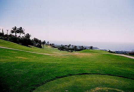 2003年2月22日ラウンド。 1999年に、オーシャンコースをラウンドしたのですが、マウンテンコースのプレーは今回が初! ![]() クラブハウスあたりから見ると、マウンテンコースがレイアウトされているのは、山あい。 コースの名前のとおり、とんでもない山岳コースをイメージしていたのですが、意外といいコースでした!^^ まず、多くのホールは山に対して段々畑状に横にレイアウトされており、思ったほど各ホールのアップダウンはきつくありませんでした!(^^; 数ホール、けっこう打ち上げになっているホールや、打ち下ろしホールがある程度でした! しかし、フェアウェイが横(海側に向かって下がっている)に傾斜しているホールはけっこう多いです。 横幅もそれほど狭くは感じませんでした! かえって、オーシャンコースの方が、すぐわきにコンドミニアム群があるので、圧迫感があると思います。 しかし、予想以上によかったのは、コースコンディション! ティーグランドは、今一でしたが、フェアウェイ、グリーンの状態は非常によかったです!(^^ この状態なら、もしかすると、オーシャンコースもよくなっているかも? (1999年にオーシャンコースをラウンドしたときは、コースコンディションが悪かったため、オーシャンコースはCランクにしていました! そういえば数年前から、オーシャンコースで、LPGAツアー「武富士クラシック」を開催しています。 そのため、メンテナンスに力を入れ、コースコンディションがよくなった!ということも考えられます! バンカーの砂は、オーシャンコースと同じく、直径3ミリ〜5ミリくらいの砂利でした!(^^; 数ホールのティーグランドに、1センチくらいの太さの雑草みたいな草が混在。 ラフの一部も、同様の草がけっこうありました。 グリーンは、非常に転がりがよく、なめらかでまずまず! 特に順目の下りは速く、横のラインは順目方向にかなりきれます。 海の方向へ順目でした。 かといって、逆目でも、それほど遅くはなく、いい転がりしてました。 ほとんどのホールで、海を見渡すことができ、非常にいい景観といえます。 また、各ホールのインターバルや、ホールのところどころに、色とりどりの花が咲いていて、きれいでした!(^^ コースには、溶岩が露出しているところなどもあります。 OUTはパー3が3、パー5が3でパー36。 4つのパー3のうち、3ホールは池越えホール。 クラブハウスは、オーシャンコースと共通。 コースのロゴが1999年のときと変わっていました! バッグタグ、ボールマーカーも新しくなっています。 スターターのいるカウンターにおしぼりがありました。 ■スコアカード 2003年時のスコアカード。 カラーになっていましたが、少しザラザラした感じの光沢のない紙を使用。 オーシャンコースのスコアカードと共用で、裏面にオーシャンコースののものが記載されています。
