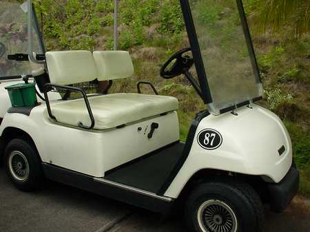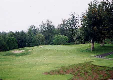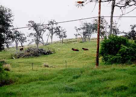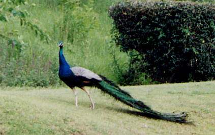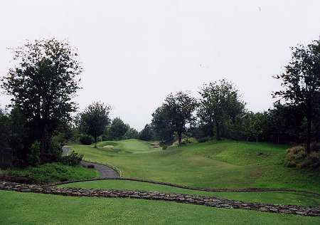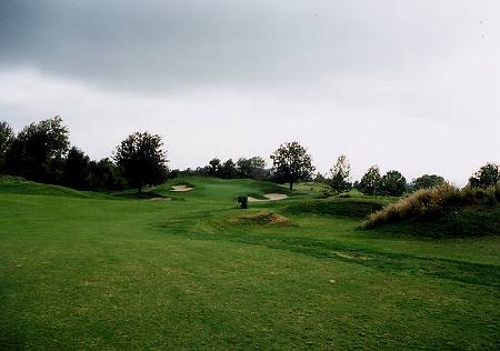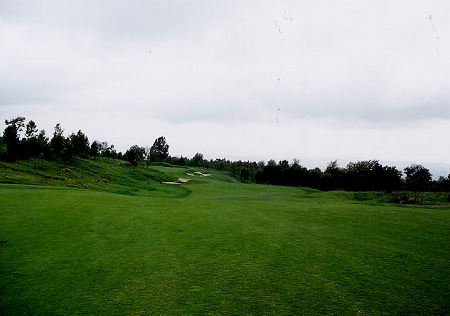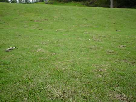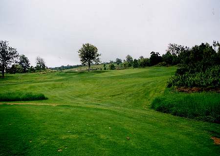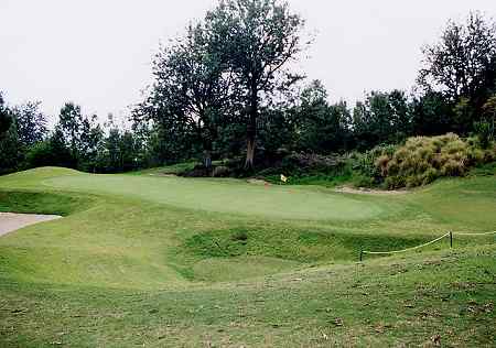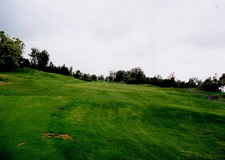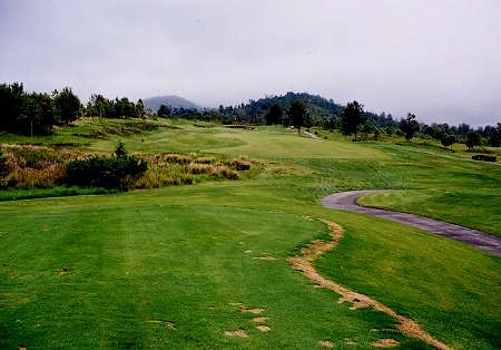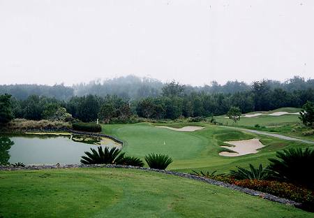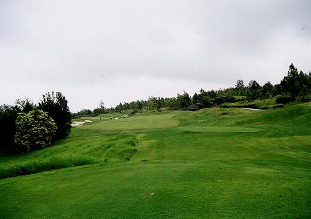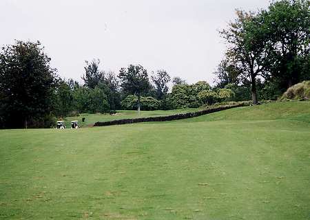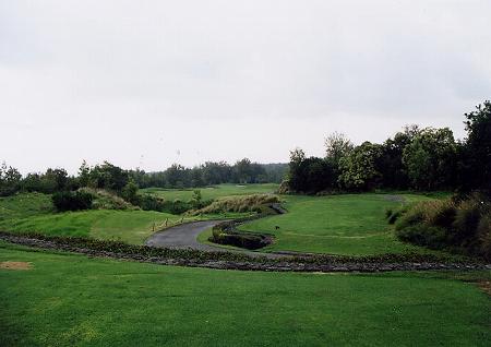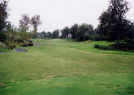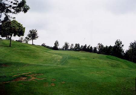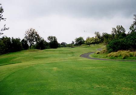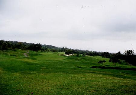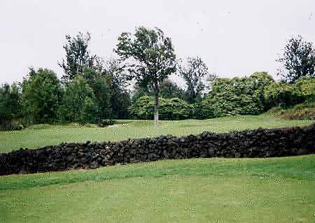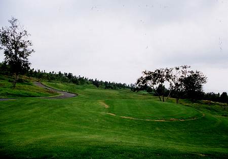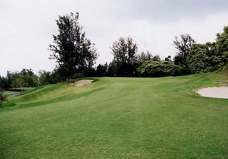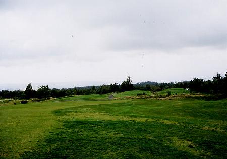 2002年4月26日にラウンド。 コースは、コナ空港から、山側のルート190(MAMALAHOA HWY.)沿いの、標高のやや高いところにあります。 ![]() 期待していたのですが、なんか、とんでもないコースでした!(^^; まず、1番ホール。いきなり、ものすごい打ち上げのパー4。 ”ありゃー!”と、ど肝を抜かれてしまいました!!(^^; 右の写真では、それほどの打ち上げに見えませんが、けっこう打ち上げで幅も狭いです! ![]() ![]() グリーンへ登ると、グリーンの近くに、な・なんと、野生の孔雀がいるではありませんか? (おそらく昔に人間が放したものが野生化したのでしょうが・・・?) ”おー!孔雀がいるよ!”と、みんなで、ビックリ!(^^; そして、”みゃおー”というような大きな音が、コース内に鳴り響き、最初は何の声か?と思いましたが、それは孔雀の鳴き声だったのでした! その音量が大きいので、突然、鳴かれると、”オッ!”と驚いてしまうほど・・・!^^; ![]() 次のホールでは、オスの孔雀が羽を大きく広げ、”すげーっ!” しかし、このあと、どのホールにも、コースのいたるところに、大量(100羽以上?)の孔雀が出没!! 最初に目撃したときは、珍しさに写真を撮っていましたが、ラウンドするにつれ、だんだん孔雀にも飽きてきたのでした!(^^; 巨大な鳥なので、ティーグランド近辺に出没して、威嚇され、けっこう恐かったです!(^^ そのほかにも、ターキー(七面鳥)や、カナリヤなど、さまざまな鳥が出現しました! さて、コースですが、ここは、はっきりいって山岳コースといえます!(^^; 全体的に、かなりのアップダウンがあるのです。 日本では、これくらいの山岳コースはいくらでもありますが、まさか、ハワイに、これほどの山岳コースがあろうとは・・・!(^^; 狭いホールが多く、トリッキーなコースといえるでしょう! また、ホールとホールのインターバルの距離が長いこと!!(^^; 乗用カートだからいいようなものの、延々と走行するようなところも・・・。 アップダウンが激しいばかりか、幅が非常に狭いホールが多く、OBはありませんが、まわりはブッシュで、コースアウトするとロストボールとなります!(^^; さらに、ほとんどのホールのティーグランドは、サイドヒル(左足さがり、左足あがり)、アップヒル(つま先上がり、つま先下がり)のどれかになっていて、かなりの傾斜&デコボコ。 多くが左足さがりで、ドライバーでのティショットは、非常に打ちづらかったです!(^^; ”打ち上げホール”や、”ティーグランドから打ち下ろしでグリーンへは打ち上げ” といったホールが多いため、グリーンは砲台系が半分くらい。そしてガードバンカーが多く、けっこう効いています。 グラスバンカーもありますが、草がないので、ほとんどベアーグランドのバンカーでした!(^^; 8番あたりから11番あたりまでのホールは、アップダウンは少し落ち着き、見た目はきれいなレイアウトのホールです。 最大の難点は、コースコンディションの悪さ。 フェアウェイは、一応バミューダグラスなのですが、ウィード(雑草)のがかなり多く、芝が薄かったり、ハゲていたりして泥が露出しているところも多く、かなりまだら。地盤も硬く最悪です。 ラフは野芝のようなのが生えてますがほとんど雑草。そのまわりは、ブッシュでひざくらいの長さ。 ティーグランドは、泥がほとんど露出していてボコボコ。 傾斜がきつく、ライが悪いので、しっかりとミートすることが困難でした!(^^; グリーンは、ハワイでは珍しく、ベントグラスを使用しています。 ただ、けっこう転がりはいいのですが、コンパクションがやわらかく、修復していないボールマーク跡、ボールマーク跡が枯れたところが目立ち、それほどきれいではありませんでした。 コースのまわりの景観は、コースの標高が高いので、はるか彼方に、コナ空港や海岸線が見渡せます。 しかし、この日は、なんかモヤ?がかかっていたようば感じで、水平線と空との境目がわからないような状態。 すっきりと空気が澄んでいれば、けっこういい景観なのでしょう!? ゴルフコースの立地は、標高が2100〜2800フィート(約630〜840m)。 少しひんやりとした風が吹きますが、この日は、それほど涼しいというほどでもなかったです。 カートは、フェアウェイを走行できますが、アップダウンが激しいため、傾斜のきついところは走行できません。 また、グリーンの近くは走行できません。 パートナーがカートをグリーンサイドにまわすような場合、ボールが傾斜のきついところに止まった場合など、自力でかなり登ることになるので、他のコースに比べて非常に疲れます!(^^; (日本ではこれくらいは普通なのでしょうが、1日2ラウンドしたりして、疲労が蓄積しているRYOにとっては、過酷でした!^^;) ”ハワイでリゾートゴルフ! 楽々プレー!”なんていうイメージとはほど遠いです!(^^; プレー時間も非常にかかり、1ラウンド約5時間かかりました! プロショップの外に、”ビッグアイランドのリゾートコース以外ではNO.1コ