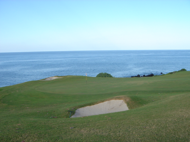 ■コース景観:A 3番、海越えホールは、素晴らしいです。 11番ホールグリーンも、海が近くて、GOOD。 ほか、18番ホールをはじめとして、遠くに海が見えるホールが多いです。 ただ、3番、11番ホール以外は、ちょっと地味な雰囲気で今一ですが、海越えホールがあるので A としました。 ■コースレイアウト:B ロバート・トレント・ジョーンズ・シニア設計ですが、全体的には、今一という印象です。 3番の海越えは、景観もよく最高ですが、そのほかのホールは、アップダウンがけっこうあり、ほとんどが砲台形グリーン。 また、全体的にトリッキーな感じで、RYOの好みではありません。 コースパンフレットでは、シグネチャーホールは、3番、11番、18番の3ホール。 しかし、最大のメインイベントホールである、海越えの3番が、スタート早々に終了してしまうのは、ちょっとさみしいです。どうせなら、15〜17番あたりになっていればよかったのですが・・・。 海越えホールがあるので B としましたが、なければ C ■コースコンディション:B 全体的には、Bといったところでした。 ![]() フェアウェイ(バミューダグラス):B 全体的には、まずまずといったところ。 ところどころ、芝が薄いところがあり、Bとしました。 ![]() グリーン(バミューダグラス):A 芝の密集度が高く、状態としてはきれいで、A をつけられます。 芝目は、かなりきつく、上りの逆目と下りの順目のラインでは、かなりの差があります。 コンパクションは、普通といったところ。 バミューダグラスのグリーン特有で、ボールマークはあまりつきません。 スピードは、順目は、けっこう速いですが、逆目のラインは、非常に遅いです。 全体的は、遅いといってもいいでしょう。 芝目は、海へ向かって順目です。 ![]() ティーグランド(バミューダグラス):B やや芝が薄いところもあり、全体的にはBといったところ。 ![]() ラフ(バミューダグラス):B ラフの状態も、まあまあ。 ところどころ、芝の隙間があるくらい。 ボールが浮いた状態のときは、打ちやすいです。→ ただ、クラブはけっこう、つっかかります。 ![]() ボールが沈んだ状態。→ バミューダグラス特有の鳥の巣のようなところにスッポリ入ることもあります。 このようなライだと、脱出困難。 欲張らずに、番手を下げて、脱出優先を心がけたほうがいいでしょう。 ![]() バンカー やや白っぽく、砂利っぽい砂を使用。 かなり粒が大きいので、クラブが傷つく可能性大。 けっこう硬めです。 ■快適度:B アップダウンが多く、レイアウトが今一なので、C にしたいところなのですが、海越えの3番ホール、グリーンが海に近い11番ホールは、非常に気持ちがいいので、B としました。 ■難易度 レギュラーティーからでも6365ヤードあり、アップダウンが多く、ほとんどが砲台形グリーンで、けっこう難しいという印象。、 ■グリーン難易度 グリーンのうねりは、それほどでもなく、手前から奥へ上っているスロープといったグリーンが多かったように思います。 上りの逆目は、どうしても打ち切れず、逆目の下りは速く、芝目がきついので、けっこう難しいという印象。 ■おすすめ度:B 世界的にも有名なコースなので、一度はプレーしている価値はあると思います。 3番の海越えホールは、チャレンジしがいがあることでしょう! ただ、アップダウンが多く、ややトリッキーなレイアウトなので、3番以外は、コースの好みが分かれるところ。 初心者には難しいと思いますので、あまりおすすめはしません。 総合評価:B 3番海越えホールは、一度はプレーしてみる価値があります。 3番と11番ホール以外は、ややトリッキーな感じで、ほとんど砲台グリーンで、全体的には今一。 コースコンディシヨンは、そこそこですが、Bとしました。 |