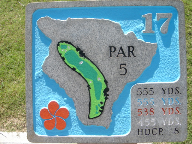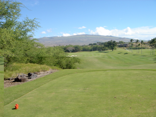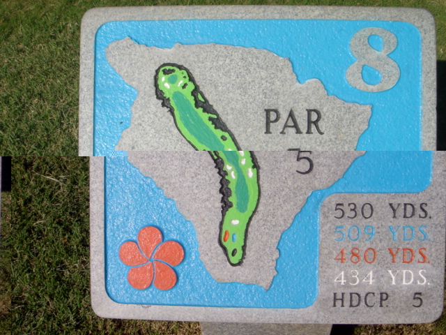 2006年2月11日ラウンド(3回目) 朝7時10分くらいのティータイム。 2日前に、電話で予約しました。 この日は、ほとんど無風で、けっこう暑かったです。 ロバート・トレント・ジョーンズ・シニア 設計。 3回目ですが、やはり、アップダウンが多く、全体的には、ややトリッキーな印象です。 海越えの3番ホールがありますが、それ以外のレイアウトは、今一かな? コースコンディションは、まあまあといったところでした。 ティーマークは、チャンピオンシップティー(ブラック):7124ヤード、トーナメントティー(ブルー):6737ヤード、レギュラーティー(オレンジ):6365ヤード、フォワードティー(ホワイト):5277ヤードの4ヶ所。 各ホールは、ほとんどブッシュに囲まれており、ブッシュエリアは、”ラテラルハザード”扱い。 ![]() スターティングホールは、直角に右にドッグレッグしているパー4。 ![]() ティーショットでは、幅が広めでけっこうフラット。 両サイドは、ユーカリなどの木々にセパレートされていて、木よりの右はドライビングレンジでOB、木より左はOBでなくブッシュになっています。 スターティングのホールのティーショットは、比較的打ちやすいといえるでしょう。 しかし、オレンジティーからだと、ストレートに打に焼く250ヤードで突き抜けてブッシュまでいってしまうので、ロングヒッターは注意が必要です。 フェアウェイ右サイドと、突き当たりの位置にバンカーがあります。 ![]() ←セカンドショット地点付近の、ドッグレッグのコーナーから見たところ。 右サイドには、背の高いココナッツツリーが並び、その右はOB。 セカンドショット地点より先は、打ち上げです。 グリーンは、4つのバンカーで囲まれています。 ![]() ←グリーン手前、50ヤード付近から見たグリーン。 かなり打ち上げているので、手前から砲台形となっており、グリーン面はまったく見えません。 ショットが、グリーンまで届かないと、戻ってきてしまうこともあるので、充分に打ち上げ分の距離を計算して攻めたいところ。 ![]() グリーンは、手前から奥へ上りで、スロープがかなりきついです。 また、この日は、グリーン奥にカップがきられてて、バミューダグラスの芝目もかなり強く、奥からのパットは、順目の下りとなり、非常に速く、注意しないとグリーンをオーバーしてしまうほどでした。 逆に下からの上りパットは、ショートすると、元のところまで戻ってきました。(^^; このコースの芝目は、海へ向かって順目です。 グリーンまで上ると、遠くに海が見えます。 ←グリーンの右奥、上部から見たグリーン。 フェアウェイは、写真の左方向。 ![]() 2番ホールは、左ドッグレッグのパー4。 ←のコースレイアウトでは、それほどのドッグレッグに見えませんが、かなり左へ折れています。 ![]() ティーグランドは、けっこう高台にあるので、奥と右サイドに海が見えいい景色です。 ティーショットは、強烈な打ちおろし。 オレンジティーのティーボックスからは、前方のティーボックスにじゃまされて、ランディングエリアが見えません!(^^; 非常に、ティーショットが怖いホールです。 ![]() 少し前方まで、のぞきに行くと、すごい下りスロープのうえ、幅が非常に狭い!と感じることでしょう。 左右はブッシュで、奥もブッシュ。 オレンジティーからストレートに打つと、230〜240ヤードくらいで、突き抜けるでしょう。 奥のブッシュの手前には、バンカーがあります。 ティーショットは、つきぬけないクラブでのコントロールショットが要求されます。 左へのショートカットは無謀。 ![]() ←セカンドショット地点付近から見たところ。 セカンドショットでは、フェアウェイ左サイドとグリーン奥がOB、右サイドはブッシュ。 グリーンは砲台形で、手前にバンカー。 ![]() ←グリーン左サイドから見たところ。 バンカーの砂は、白っぽいタイプで、砂利が混在。 ![]() 3番ホールは、このコースのシグネチャーホール。 そう、世界的にもあまりに有名な、”海越え”のパー3です。 3番ホールで、さっそく最大の名物ホールが登場するということは、このホールを終了すると、なんか、あとの楽しみがなくなってしまうので、さみしい感じがします。 どうせなら、15〜17番ホールにしてもらいたかった・・・。 ![]() この、マウナケアゴルフコースが完成してまもない、1964年12月8日に、当時の世界のゴルフ界のビッグ3である、、アーノルド・パーマー、ジャック・ニクラウス、ゲーリー・プレーヤーの3名がプレーしたことを記したプレート。 このプレートの奥へ歩いていくと、驚きの光景を目の当たりにすることになります。 ![]() ものすごい”海越え”です!(^^ RYOは、このコースは3度目ですが、このティーボックスまで来たことがなかったのでした! いや〜!すごい景観だなぁ〜!(^^ 感動ものです。 早朝で、やや曇っていたので、この写真では、あまりきれいに写ってませんが、ハワイのゴルフコースの中で、TOP10に入るホールといっても