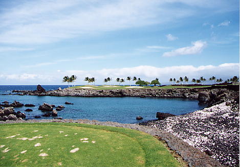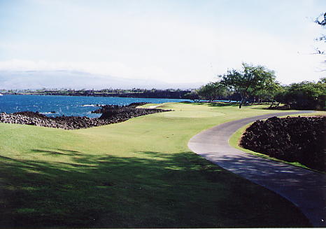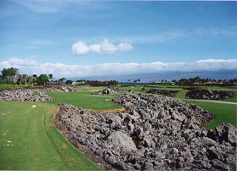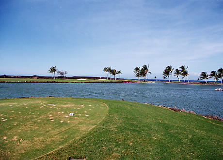 | 1999年11月28日ラウンド(この日に2ラウンド)。6、7ラウンド目。 やはり最高のコースです!^^ コンディション、レイアウト、景観のトータルが群を抜いています。 フェアウェイはフカフカでライの薄いところはほとんどありませんでした。 グリーンは固めでしたが、芝のコンディションはGOOD。 ティーグランドも申し分ありません。 ![]() コース内は、樹木が少なく360度の大パノラマの他では味わえないロケーション!溶岩の中にレイアウトされた各ホールの景観は素晴らしいの一言です。 まわりには、マウナケア、マウナロアの山々が一望でき、海は水色に輝き、まさにラニ(天国)という名にふさわしいコースだと思います。^^ 3番ショートホール→ ただ、この日は1日中強風で、翌日からメンテナンスのため1週間くらいクローズになってしまったのが、残念でなりません。^^;ギリギリで1日だけでもプレーできてよかったですが・・。 しかし、この日の強風は半端じゃありませんでした!^^;日本だったら、強風警報が100%発令されるでしょう。台風並みの風でした!^^;(左写真:パームツリーの葉が折れてました!^^;) なにしろ、グリーン上では、傾斜、芝目よりも風が一番影響されました。 上りのラインでも、フォローでは止まらずにグングン大オーバー。 下りのフォローでは、グリーンからでてしまうこともしばしば!^^; また、パットするとき、静止してたボールが1mも転がってしまったりもしました。^^; さらに、強風にあおられて、パッティングのテークバックがまっすぐに引けないのです!^^; アプローチでも散々!転がしていくと、風の方向にどんどん転がっていき、フワっとしたボールを打つと、距離がまったく合わず、風に流されていきました!^^; この強風の中、2ラウンドしていると、不思議なことに、あるホールは風が弱いことに気づきました。 このコースは、樹木が少ないため、全ホール吹きっさらしのようなのですが、1、18、10、12あたりは、特に強く、たまたまなのか、海越えの15番と14番は、少し弱かったのです。 海越えの15番は、2ラウンドとも、風にそんなに影響されることなくプレーできたのが、なによりもラッキーでした。^^今回、6ラウンド目ではじめて、チャンピオンティー196yにチャレンジ!^^2アイアンで、2度とも1オンに成功してパー! これだけで、大満足です!^^ やはり、チャンピオンティーからの海越えは、最高の景観! そして、気合がはいるし、1オンに成功したときの喜びは格別です!^^ しかし、このコースがいつも強風というわけではありません! やはり、日によるのです。運といいますか・・! 3日後からは、毎日、パッタリ風は止みましたので、サウスコースがクローズだったのが残念でなりませんでした! ![]() 7番ショートホール。左サイドには、水色の海が広がっている美しいホールです。ホワイトティーから163y。 ![]() 12番ショートホール。ホワイトティーからは162y。 巨大な池越えになります。風が強いとクラブ選択に迷います。 ![]() 14番ミドルホール。ティーグランドは、少し溶岩越え!^^ コンディション:A フカフカで申し分ありません!^^ フェアウェイ:A グリーン:A ティーグランド:A ロケーション:特A レイアウト:特A プロショップ それほど豪華ではありませんが、品揃えは多く中は広い。 シャワールーム、ロッカールームなし。 バッグタグ: 何も言わなくてもつけてくれるときと、言わないとつけてくれないときがありますので、もし、つけてくれなかったときは、”プリーズ、バッグタグ”と言えば、快くつけてくれます!^^ カート フェアウェイ乗り入れOK クーラーBOXあり。 中には、氷とミネラルウォーターが4本入ってます!もちろんサービスです。 ヤーデージブック:あり。有料$5。 (2年前までは、サウスとノースが1冊で$5だったのに、サウスとノースが別々になって、各$5ずつ!になってました^^;) 料金:$95(リゾートゲストフィー)(TAX込) リプレイは、$25でした。 総合評価:特A |