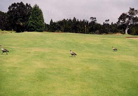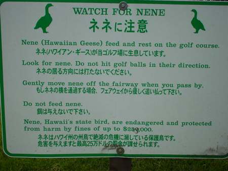 2003年2月23日ラウンド。 キラウエア火山の火口の近くにあるコース。 すぐ近くに、「キラウエアビジターセンター」があります。 コナエリアから行くと、このコースはなにしろ遠いです!(^^; ヒロからだったら、1時間くらいなのだと思いますが、カイルア・コナから2時間半(ちょっと休憩込みで)かかりました!(^^; あらためて、ビッグアイランドの大きさを実感したのでした!(^^; なにかのガイドで、”3番アイアンでキラウエアの火口まで届く”と書いてあったのですが、それらしいホールはないし、火口もまったく見えませんでした!(^^; 標高は約1000mくらいなので、少し風がひんやりしていて、涼しいといえます。 池は1コだけ。 シグネチャーホールといえるホールはないといえます。 バンカーは、小砂利。その下はすぐ泥。 10番のバンカーだけは、なぜか、細かい白い砂がはいっていた。 多少のドッグレッグあり。 コース自体はフラットですが、フェアウェイには、マウンドなどで、けっこうデコボコをつけてあります。 真ん中に巨大な木があるホールなど。 印象に残るホールといえば、倒木があって、そこから細い木が生えているホール。 左サイドには、このコース唯一の池がありました! ほかに、巨大グラスバンカーみたいなのが・・。 池が埋まったというような気もする。 各ホール間は、樹木があり、林間風。 松など、いろいろな木があり。 グリーンと次のホールがけっこう近いところにあります。 バックティーからだと、2つのホールがクロスしているところもあり! コースコンディション: フェアウェイ(キクユ):B 別の草(紫色)が混在していて、見た目はハゲのようにみえしたが、 ハゲではなく、別の草の混入によるもの。 フェアウェイの状態自体はまあまあ。 ラフ:C〜D ハゲているところや、クローバーなどの雑草も多く、草ボウボウのところもあり今一。 ティー:C〜D Cくらいのところもあるが、ディボット多いところや、 ハゲているところも多い。 グリーン(バミューダ):C 芝が茶色くなっているところがあるが、ハゲではなかった。 雑草混入のところや、ハゲがあるグリーンもあり、転がりが不均一。 全体的には遅め。 芝目はやや効いていた。 レイアウト: シグネチャーホールといえるホールはない! 全体的にはフラットで幅は広め。ただ、フェアウェイにはマウンド、などでデコボコにしてある。 OBは外周くらい。 コース内に、ネネ(ハワイの州鳥)がけっこういます。 なにしろ、コハラコーストから行くには、遠いです! ヒロからなら、それほどでもないですが、コナからだと2時間半(サウスまわりで)かかります!(^^; ![]() ![]() ![]() ![]() ![]() ![]() ![]() ![]() ![]() ![]() ![]() ![]() ![]() ![]() ![]() ![]() ![]() ![]() ![]() ![]() ![]() ![]() ![]() ![]() ![]() ![]() ![]() ![]() ![]() ![]() ![]() ![]() ![]() ![]() ![]() ![]() ![]() ![]() ![]() ![]() ![]() ![]() ![]() ![]() ![]() ![]() ![]() ![]() ![]() ![]() ![]() ![]() ![]() ![]() ![]() ![]() ![]() ![]() ![]() ![]() ![]() ![]()