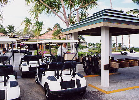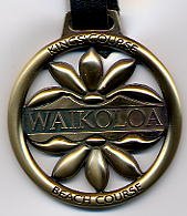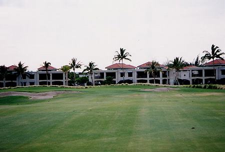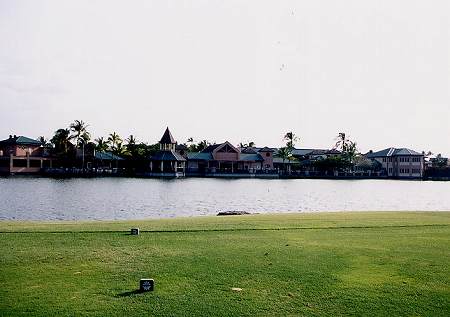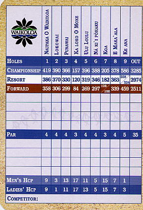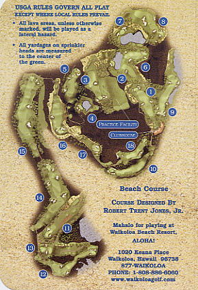 2000年8月25日にラウンド(3回目)。 実は、正式なコース名称はよくわかりません!(^^; このタイトルのコース名は、スコアカードに書いてあったものを掲載していますが、他のものを見ると、”ワイコロアゴルフクラブ・ビーチコース”と記載されているものもあるのです!(^^; キングスコースが新設されてからは、後者の名称が正しいのかな?とういう気もします!? 8年ぶりにラウンドしましたが、はっきりいって、ほとんどコースは、覚えていませんでした!(^^; ビーチコースとはいえ、海に近いホールは、 あまりありません。 12番のグリーンが海の近くにあるだけです。 コースの雰囲気、レイアウトはまあまあといったところでした! 以前ラウンドしたときは印象がありませんでしたが、池がらみのホールが多く、意外でした!(^^; もしかしてコースを改造したのかな??? 9番ホールは左サイドに巨大な池がずっと奥まであり、池の向こう側には、キングスショップがあり、美しいホールです。 キングスショップは、東京ディズニーリゾートのアンバサダーみたいな雰囲気の建物が連なり、とてもおしゃれな景観です!(^^ コース自体は、パー70で 少し物足りないところがあります! フェアウェイのコンディションは、まあまあでしたが、グリーンはあまり刈っていなくて、かなり遅く、つまらなかったです!(^^; 昨年11月にも、ここに訪れ(キングスコースだけラウンドして、ビーチコースはラウンドしませんでしたが)、取材だけしに来た時は、カートにGPSシステムが搭載されていました。 しかし、現在はGPSがない!ではあーりませんか!(^^; ついているカートとついていないカートがあるかもしれないので、プロショップのスタッフに聞いてみました! すると、今年から、GPSはすべて撤廃したのだそうです! 理由は、経費が莫大にかかるから・・・!!(^^; さらに、撤廃されたのは、ビーチコースだけでなくキングスコースもです!(^^; せっかくGPSを楽しみにしていたので残念。 問題なのは、ビーチコースはGPS導入していたため、ヤーデージブックも撤廃していたのです!(^^; そのため、GPSが撤廃された現在でもヤーデージブックもなく、レイアウトがよくわかりません! しかもスプリンクラーの数が少なく、残り距離に苦労しました!コース内には、100y、150y、200yのポールがありますが、表示はかなり甘いように感じました!(^^; ■ロッカールーム なし。 ■シャワー なし。 ■レストラン あり。 ■ヤーデージブック なし。 ■バッグタグ スターターに言えばくれます!