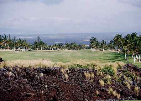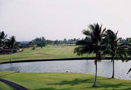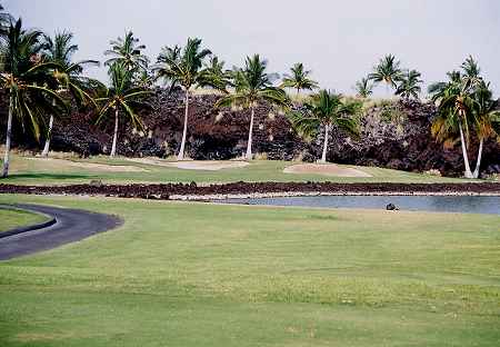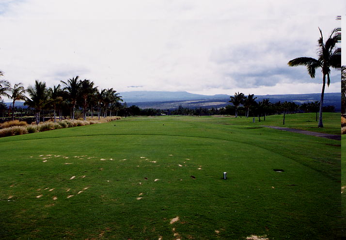 ![]() No.1 Par 4 「NAUPAKA O WAIKOLOA」 ■419yard □386yard ■358yard スターティングホールは、ストレートのパー4。 ![]() 左サイドはブッシュエリアですが、幅は広めでティーショットは打ちやすいホールです。 ![]() セカンドショット地点付近。 フェアウェイは広くて、ほとんどフラット。 グリーンの両サイドにバンカーがありますが、手前の花道が広いので、スコアをまとめやすいスタートホールといえるでしょう! ![]() No.2 Par 4 「LOKOWAI」 ■390yard □370yard ■306yard だいたいストレートなのですが、グリーン手前で左へカーブしているパー4。 ![]() 両サイドにココナッツツリーがありますが、幅は広めなので、ティーショットは打ちやすいです。 ![]() 2番ホールのティーグランド右にあるコンドミニアム「ワイコロア・フェアウェイ・ヴィラス」。 コンドのあるところはOBエリアです。 ![]() ←フェアウェイ左には、バンカーあり。 リゾートティーから194ヤード地点です。 フェアウェイはフラット。 ![]() セカンドショット地点付近。 このあたりから左へ曲がっていて、グリーン手前には大きな池が横たわっています。 セカンドショットは池越えとなり、迂回ルートはありません! グリーン左奥と右手前にバンカーあり。 ![]() No.3 Par 4 「PUNAWAI」 ■336yard □330yard ■299yard ほとんどストレートでフラットなパー4。 距離は短めで、やややさしめのホール。 ![]() 幅はそこそこ広めですが、右サイドには溶岩で造られた壁があり、やや視界を狭くしています。 リゾートティーから162ヤード地点フェアウェイ左にバンカーがあり。バンカー越えにはキャリーで183ヤード(レゾートティーから)。 ![]() ←ティーグランドの右を見たところ。 右の溶岩の壁は、ここから連なっています。 ![]() セカンドショット地点付近。 ここは、フェアウェイバンカーの先あたり。 バンカーは、グリーン左右にありますが、手前は広い花道です。 ![]() No.4 Par 3 「KA LOKO O MOKE」 ■157yard □120yard ■84yard 最初のパー3は、池越えホール。 ![]() リゾートティーからは120ヤードなので、それほど難しくはないのですが、池は大きく、グリーンのすぐ手前まで広がっています。 また、池は右奥へ伸びているので、右に打ってしまうと池ポチャとなるので要注意! バンカーをグリーン奥に3つあり。 ![]() No.5 Par 4 「ULU LOULU」 ■419yard □386yard ■358yard 右カーブしているパー4。 ![]() 幅は広めで視界も広いです。 ティーグランドすぐ前に溶岩エリアがありますが、ショットには影響なし。 ![]() ←ティーグランド前の溶岩。 溶岩の隙間から、ススキみたいな草が生えてます! ![]() No.6 Par 4 「NA KI'I POHAKU」 ■388yard □346yard ■297yard ストレートのパー4。 ![]() ティーグランドのまん前に池があり、ティーショットは池越えとなるホールです。 この池は2番ホールにあった池と同じ。 左サイドは溶岩エリアで、幅はやや狭め。 リゾートティーからの池越えは、キャリーで150ヤードくらいなので、力まなければ問題ないでしょう! ![]() セカンドショット地点付近。 グリーン左右にバンカーがあります。 グリーン奥に見えるコンドミニアムは、2番ホール右と同じ「ワイコロア・フェアウェイ・ヴィラス」。 ![]() No.7 Par 3 「KOA」 ■205yard □182yard ■128/100yard 7番パー3も、池越えホール。 ![]() 池は大きく、よく効いています! リゾートティーからでも182ヤードあり、グリーンすぐ手前まで池。 グリーン左右にはバンカーあり。 ![]() ←ティーグランドから、右斜め前方向を見たところ。 (グリーンは写真の左端。) 池の奥は8番ホール。 ![]() No.8 Par 4 「E MAKA'ALA」 ■378yard □363yard ■339yard 最初は右ドッグレッグで、グリーン直前でやや左へ曲がっている、やや逆S字形のパー4。 ![]() ホールの幅自体は広めですが、フェアウェイは絞られていて、バンカーあたりから急激に右へ曲がっています。 ティーショットでの狙い目は、まっすぐバンカー越えルートで、リゾートティーからはキャリーで180ヤードくらいかな? ロングヒッターは、さらに右方向狙いがいいでしょう! このホールのティーグランドは、かなり荒れていました!(^^; ![]() セカンドショット地点付近。 グリーンは、この写真の真ん中方向。 グリーン手前60ヤード付近右サイドにバンカー。 さらに、グリーンまわりにも、4つのバンカーがあります。 ![]() グリーンの右サイドから見たところ。 ![]() No.9 Par 5 「KE ANE」 ■586yard □558/524yard ■459yard やや逆S字形になっているホールです。 ![]() 幅はそこそこですが、最初は右へドッグレッグしていて、左サイドは池なので要注意。 右のフェアウェイバンカーを越えるには、リゾートティーからキャリーで240ヤード必要です。 ![]() ティーグランドの左横からずっと、左サイドには池が広がっています。 ![]() ←ティーグランドから左サイドを見たところ。 ![]() 池の奥に見える建物群は、ワイコロアリゾート内にある「キングス・ショップ」。 薄い緑色っぽい屋根と、薄いピンクっぽい壁で、パステルカラー調で、けっこうしゃれた建