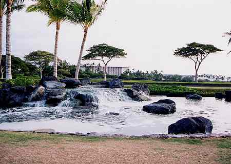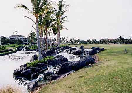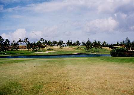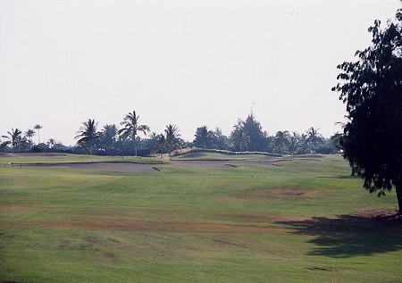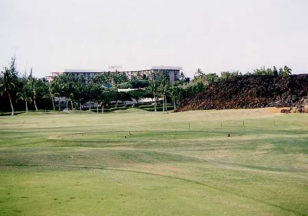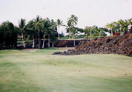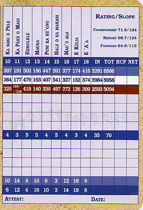 2004年3月4日のPMにラウンド(4回目)。 このコースでのラウンドはひさしぶりでした。 前回は、サスペンデッド寸前だったので、後半のラウンドは、あまりに急いでプレーしたためあまり記憶がなかったのです。 今回は、そんなこともなく、いろいろ思い出しながらのラウンド。 この日は、2ラウンド目で疲労もあり、レギュラーティーからのラウンド。 このコースは、パー3が5ホール、パー5が5ホールあり、パー70となっています。 パー70とはいえ、リゾートティーからのトータル距離は約6000ヤードのため、パー72のコースに換算すると実質7200ヤードくらいはあるのかな? そのため、各ホール自体はそれほど短いという感じはありません。 コースは全体的にフラットで、幅は広めです。 ところどころ溶岩エリアがありますが、溶岩にの中にレイアウトされている”ラバデザートコース”という感じはありません。 フロントナインは9ホール中、6ホールが池がらみ。 池をなんとかクリアすれば、バンカーがあまり効いていないし、砲台形グリーンもほとんどなく、全体的にはそれほど難しくはないので、好スコアも期待できます。 とはいっても、パー70ということを考えると、あまり喜べないかも???(^^; コースコンディションは、全体的にまずますでした。 ただ、いくつかのティーグランドの状態は悪かったです。 シグネテャーホールは、12番パー5。 グリーン奥がすぐ海が広がっているきれいなホールです。 しかし、このホールもグリーンの奥まで足を運ばないと海がよくみえないので、あまり印象に残らない可能性もあります。(^^; そして、このコースは、コース全体がフラットなため、ほかのホールからは、海はほとんど見えません。 せっかく海の近くに展開されているコースなのに、海がほとんど見えないというのは、ちょっと残念なコースなのです。 どうせなら、もっと海沿いや海越えホールを造ればよかったのに・・・。 ほかに、少し印象に残るホールは、10番。 グリーンの奥が溶岩の壁に囲まれているホール。 また、9番は、ホールの左サイドに、巨大な池。そしてその奥には ”キングスショップ”が見えて、非常にきれいなロケーション。 その池のセカンドからサードショット地点あたりでは、滝も流れていてきれいです。(^^ ![]() どうしても、納得いかないのが、距離表示。 どうも、各ホールの距離が長いような感じなのです。 たとえば、スコアカードやホールのプレートの表示は、360ヤードくらいで、パー4。 風もなく、ティーショットをドライバーでナイスショットして、残りの距離表示を見ると、180ヤード。 ホールのトータル距離から逆算すると、ティーショットが180ヤードくらいしか飛んでないことになります。 ほとんどのホールでそんなことになりました。 また、フェアウェイセンターに残り150ヤードのポールがあるのですが、見た目もそうですが、実際にショットをしてみると、ナイスショットしても必ずショートして、150ヤードとは思えませんでした!(^^; 前日プレーしたキングスコースでは、そんなことはなかったのですが・・・。 今回、以前廃止されていたヤーデージブックが、また復活してました!(^^ ■コース設計 ロバート・トレント・ジョーンズ・Jr. ■ホール数、パー 18ホール Par 70 OUT Par 35、IN Par 35 フロントナインはパー5が1つ、バックナインは、パー3が3ホールずつで、各パー35。 18ホール中、パー3が5つ、パー5が3つ で パー70 という、ちょっと変則な構成。 ■ティーマーク、距離、コースレート、スロープレート ティーマークは3ヶ所。 パー70で、トータル距離は短いです。 ただ、パー5が全部で3ホールということを考えると、パー72とした換算した場合、リゾートティー(レギュラー)からの距離は、7100〜7200ヤードくらいと考えられるので、普通くらいかな?