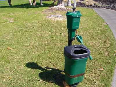 ■距離表示 ■アクセス コナ空港から、ルート19「QUEEN KAAHUMANU Hwy.」を北上します。 40分くらい走行して、左に「ワイコロア・リゾート」のゲートがある信号を左折。 ゲートから少し走行すると右へ行く道路がでてきたら、そこを右折します。 突き当たりを右折すると右手にクラブハウスがあります。 ビーチコースとキングスコースのクラブハウスは別の場所です。 (キングスショップが右手にでてきたら、行き過ぎてますので、キングスショップのパーキングでUターンしましょう! ※2010年の情報では、ビーチコースのクラブハウスは廃止され、キングスコースのクラブハウスに統一されたとのこと。 2010年9月に、RYOも行くので確認してきます。 ■クラブハウス キングスコースのクラブハウスは比較的新しく、中央に八角形?の塔のような部分があり、ちょっとしゃれた建物です。この写真の少し先に、「BAG DROP」するところがあります。 ![]() クラブハウス正面入口。→ 中央が八角塔。 プロショップは右側にあります。 ![]() 18番グリーンから見たクラブハウス。→ ■プロショップ ![]() プロショップ内は、天井が高く、そこそこの広さがあり、きれいです。 プロショップにあるキャッシャー。→ チェックインはここでやります。 ![]() プロショップには、オロジナルロゴマーク入りのグッズなど、品揃えも豊富。 階段があり、2階にも商品が陳列されています。 ![]() 階段の壁にかかっているゴルフコースの写真。→ ハワイのコースではなく、「リフレクションズベイ・ゴルフコース」というラスベガスのコースの写真などでした! ![]() プロショップの床は、カーペット。→ あまりフカフカ感はなく、今ではそれほどきれいくないかな!? ■レストラン クラブハウス正面から左側にあります。レストランの入口。→ ![]() レストランは、木製テーブルと椅子。→ ![]() レストランのテラス席。→ ■スナックショップ なし。 ■スナックカー ![]() スナックショップはありませんが、スナックカーがコース内を巡回しています。→ ■ロッカールーム・ロッカー なし。 ■シャワー あり。レストルームの奥にシャワーはあります。→ タオルはありません。 ■風呂 なし。 ■レストルーム クラブハウスにあるレストルームの洗面台。→まあまあきれいです。 ![]() コース内にあるレストルーム。→ それほどきたなくはなかったかな!? ■スターターカウンター あり。 ■乗用カート 2人乗り乗用カート。電動式カート。 前面のプラスティック板はついていません! ![]() カートの前についている、ワイコロアのロゴマーク。→ ![]() カート後部に、小物を入れるカゴあり。 ディボットボトル装備。 クーラーボックスあり。 氷とミネラルウォーター2本(サービス)入っています。 ![]() カートのハンドル部に、スコアカードがセットされています。→ ![]() ハンドルの下方に、小物入れるスペースあり。 ティーペグがささっています。 ハワイのコースには珍しく、タオルを装備。 ■ドライビングレンジ あり。フラットで、幅、奥行きも広いです。 300ヤードくらいあるかな? ![]() 天然芝から打つことができます。 たしか、プレーヤーは無料!? ■チッピングレンジ あり。アプローチ、バンカー練習場あり。 グリーンもあります。→ ![]() グリーンの芝は、ちゃんとカッティングされていました。→ ■パッティング練習グリーン あり。 ■その他設備 ■ボール洗い機 ティーグランド付近に、ボール洗い機があります。→下方にはゴミ箱もあり。 ■ティーマーク 石に色を塗ったティーマークです。→■ピンフラッグ フラッグには、ワイコロアのロゴマーク。→■ホールプレート ![]() 各ホールのティーグランドにあります。 石製で、小さいです。 ホールナンバーとパー、そして各ホールにつけられたホール名称が記載されています。 その下には、ワイコロアのロゴマーク。 ■サービス クラブハウスのスタート出口付近に、コーヒーのサービスあり。→朝だけあります。 時間が少し遅いとなくなっています。 補充なし。 そのほか、プレー終了後に、おしぼりのサービスあり。 絞ってなくてビショビショです!(^^; ■バッグタグ あり。 ■プラスティックボールマーカー あり。