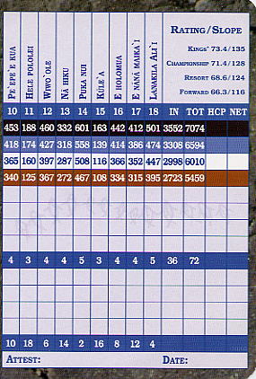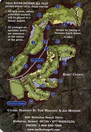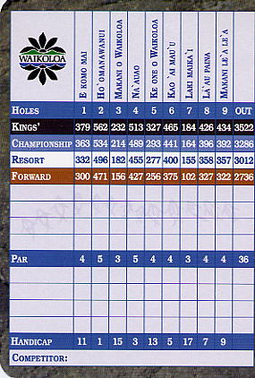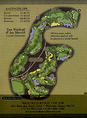 ※リゾートゲスト料金適用は、ワイコロアリゾート内のホテル、コンドミアム宿泊者。 ■コース設計 トム・ワイスコフ&ジェイ・モリッシュ ■ホール数、パー 18ホール Par 72 OUT Par 36、IN Par 36 ■ティーマーク、距離、コースレート、スロープレート ティーマークは4ヶ所。
