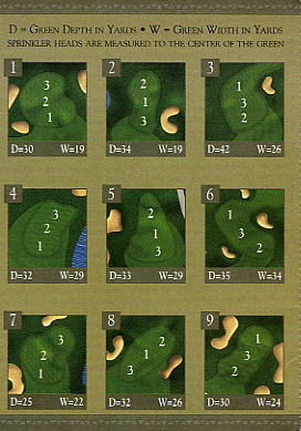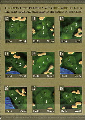 ■スコアカード スコアカードはカラー。 表紙はロゴマークと写真、裏面はコース全体のレイアウト図とローカルルール。 そのほかに、グリーン形状と幅と奥行きの距離、3分割(1,2,3)のピンポジション表がついていて、切り取り線がついていて切れるようになっています。