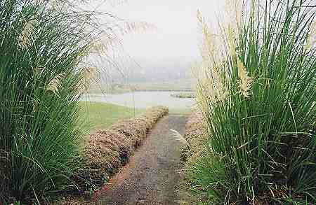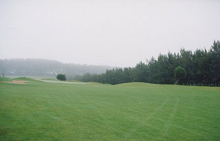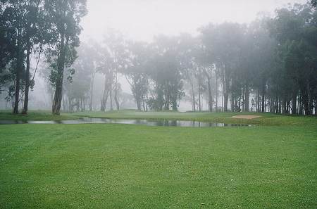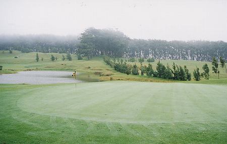 2000年8月31日にラウンド。 ![]() ワイコロアリゾートとマウナラニリゾートの間にある道路を山側へ上っていき、ワイコロアビレッジGCを行き過ぎて、さらに山を上っていきます。 つきあたりの三差路を左折し、ワイメアの町を通り過ぎ、三差路から20分くらい走ると、左側にゴルフコースの一部が見え、少し走ると、左側に鳥居みたいな形をしたゲートがあります。 ![]() ワイメアの町は、けっこう栄えていて、ガソリンスタンド、スーパー、マックなどたくさんの店がありました! それはさておき、驚いたことに、なんと、10分くらい手前のワイメアの町は晴れていたのに、コースに到着すると、雨が降っているではありませんか!^^; 霧雨!しかも寒いくらいなのです!!^^; おそらく気温は20℃以下でしょう。 ビッグアイランドCCよりもさらに標高が高く、霧雨というよりも雲の中?という感じです!^^; 何かのガイドブックに、このエリアは雨が多い!とあった記憶があったのですが、案の定・・!^^; ![]() ゲートを通過し、かなり奥まで走行すると、プレハブのようなクラブハウスがあります。 ![]() ![]() クラブハウスといっても、プロショップとスナックショップ、レストルームがあるだけです。 ![]() 簡素な建物に見えますが、新しいのできれいです。 ![]() プロショップでティータイムをとると、即OK! 予約なしの飛びこみでしたが、非常に空いているので、予約は不要でしょう!^^; 料金は、$55 でした! このコースには、スターターはいません! チェックインしたら、プロショップの前に放置してあるカートに、勝手に自分のキャディーバッグを積みます。 そして勝手にスタートすればOKでした!^^; なんと、我々以外は、誰もプレーしてないのです!^^; それもそのはず、観光客はもちろん、地元の人でも、わざわざ雨が降っているコースでプレーする ”もの好き”はいないのでしょう!?^^; そして、カートには、キャディーバッグに掛けるビニールシートはなく、傘もタオルもなし!^^; 雨がほとんど降らないビッグアイランドのコハラコーストエリアに来ているので、レインウェアは日本から持参していません! つまり、はじめから、ビショビショになる覚悟でプレーを開始しました!^^; ![]() さて、コースの雰囲気は、針葉樹が生い茂り、落ち葉が散乱、霧がかかっていて、寒く、ここがハワイであるとはとても思えません!^^; ![]() 春や秋の軽井沢あたりのコース?と錯覚するほどです。 1番ホールのティーグランドに立つと、ティーグランドのコンディションはよく、遠めから見るとコース全体が一面、濃い緑色できれいなので、期待をもたせます! ![]() フェアウェイにベアグランドはなく、遠めから見ると非常にきれいに見えますが、いってみると、フェアウェイのほとんど(全部かな?)は雑草です!^^; カットしてあり、ラフとの区別はしてありますが、よく見るとほんの芝はわずかで、クローバーなどの雑草でした! それが雨で濡れていて、クラブが振り抜けないこと・・・!^^; さらにラフの雑草は10センチくらいあり、入ると脱出困難です!^^; ラフのまわりは、50センチくらいの長さの雑草でブッシュになっていて、入れたら即ロストです!^^; ![]() フェアウェイの左サイドに池があるホール。 ![]() 右には、ハワイとは思えないような、うっそう生い茂る林が・・・。 ![]() グリーンとティーグランドはとてもいいコンディションです。 はっきりわかりませんでしたが、ベント芝のようでした!?(バミューダではなかったです!) グリーンはせっかくきれいなのに、霧雨による水滴で重くなり、あまり転がりませんでした!!^^; ![]() けっこう幅の広いホールが多いので、 雨が降っていなければ、少しは快適なプレーもできるかも・・・!?^^; ![]() ![]() ![]() コースのすぐとなりが牧場!! コースから馬が見えました!(^^; ![]() ![]() レイアウトとしては、池越えあり、ドッグレッグありで、フラットな林間コースで、バリエーションもあり、まあまあおもしろいと思います。 雑草フェアウェイからのショットは難しいですが、レイアウトしての難易度は、そんなにはないと思います。 ![]() 次のホールへ行く途中には、巨大なすすきのような草が・・・。 ![]() 池越えのパー3。 霧で煙っていて、なんとかグリーンが見えるくらいでした! とても、南国ハワイのコースとは思えない光景! ![]() フロントナインが終了した頃はもうすべてがビショビショ!^^; ウェアもグローブもシューズもソックスもキャップもパンツもキャディーバッグも・・・!^^; 濡れたウェアに風があたると、最高に寒くて、もうゴルフは、やるだけ状態でした!^^; RYOは、そんな状態なのでハーフで終了しても別によかったのですが、友人がやる気満々!^^; 仕方なく、いったんプロショップへ行き、少し休憩&温まり、続きのバックナインをすることにしたのでした! プロショップのスタッフに、”毎日雨?”と聞いたところ、”Some time! (ときどきだよ!)"と言っていました!^^; ”ほんとかぁー??”と思いました! コース内の雰囲
