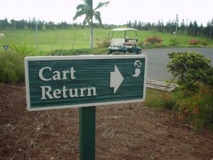 ラウンドが終了したら、カートパスに書いてある「Cart Return」、「Return to ClubHouse」、または、「→(矢印)」といった標識に従ってカートを走行させ、クラブハウスまで戻ります。