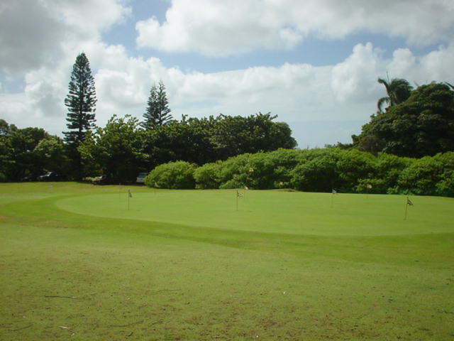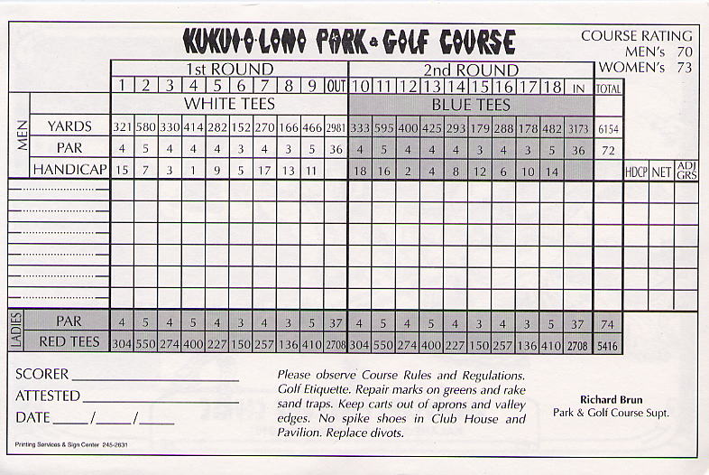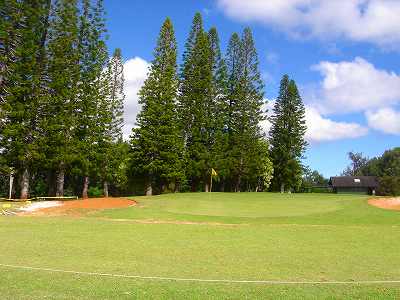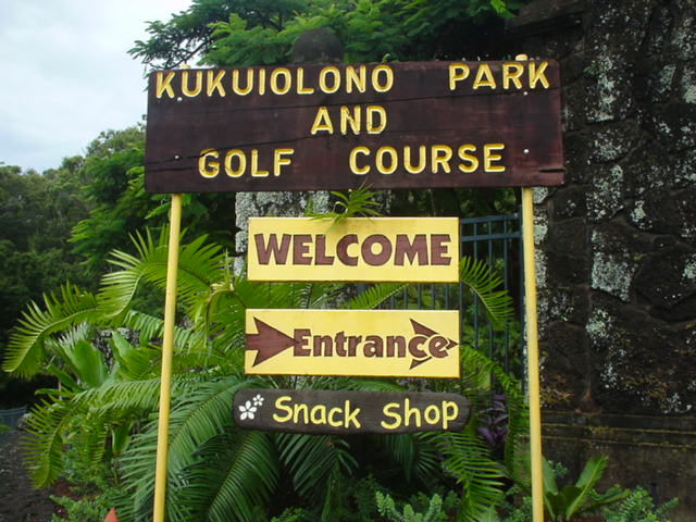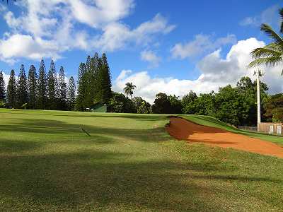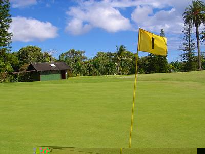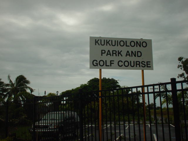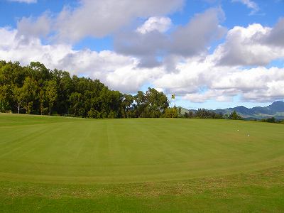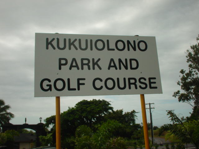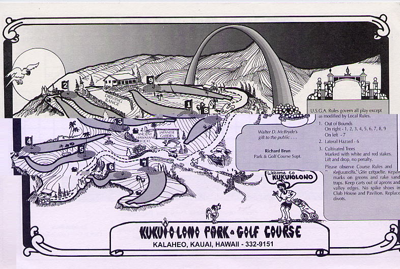 | 2006年9月20日の情報。 カウアイに来て5日目。 疲労こんぱいで、この日プレー予定だったポイプベイを断念! このククイオロノGCまで、取材に来てみたのでした!(^^ ポイプからは30分くらいでしょうか? 途中で道を間違えたので、実際には1時間くらいかかってしまいましたが・・・。(^^; ククイオロノは、ポイプをさらに先(WEST)まで行った、少し標高が高いところにあります。 以前は、”ククイオロノ ゴルフコース”という名称だったのかもしれませんが、スコアカードを見てみたら・・・。 現在のコース名称は、”ククイオロノ パーク アンド ゴルフコース” となっていました! コースは9ホールのコースで、パー36(MEN'S)。 パブリックコースなので、誰でもプレーできます。 コースへは・・・。 リフェ空港から、Route 50(KAUMUALII Hwy.)をWESTへ向かいます。 ポイプへ行く場合は、ツリートンネル(並木道)のT字路を左折してRoute 520(MALUHIA Rd.)に入りますが、そこを左折しないで、そのまま直進します。 ツリートンネルのT字路から2つ目信号があるがあるT字路を左折し、PAPALINA Rd. に入ります。 左折するT字路は、街みたいになっていて、右側にガソリンスタンド、左に消防署があり、T字路の信号の左奥角にガソリンスタンドがあるので、けっこうわかりやすいです。 ![]() PAPALINA Rd. は、少しさびれた道路ですが、道なりに奥へ進み小さな山を越えると、降りたところすぐ右に、コースの看板がでてきます。→ ![]() ![]() 看板の先すぐ右側(V字ターンします)に、「ククイオロノ パーク アンド ゴルフコース」のゲートがあります。→ なんか雰囲気は「シュラシックパーク」の入口みたい・・・。(^^; ![]() ゲートの中に入り、T字路を右折。 あとは道なりに奥へグイグイと走行すると、クラブハウスがあります。 この”ククイオロノパーク”の中には、"JAPANESE GARDEN(日本庭園)"や、"ANCIENT HAWAIIAN ROCKS(古代のハワイの岩)"があるようです。 先ほどのT字路を直進すると、そこへ行けるみたい。 ![]() ←クラブハウス。 緑色の木造のクラブハウスで、けっこうボロいです!(^^; エントランスと呼べるようなところはありません。 ![]() 上の写真の少し右に「BAR DROP」するところがあるので、ここにゴルフバッグを降ろします! ![]() ←パーキングから見た景色! はるか彼方に海が見えました!(^^ ここへ来るまで、それほど上ってきたような感じはしなかったのですが、ここからの景観を見ると、けっこう標高が高いことを実感します! ![]() さて、このコースは、けっこう標高が高いところにあるので、風が少しひんやりしていて涼しいです。(^^ 1番ホールなどを見たところ、”林間コース”といった感じ。 1番ホール。→ フラットで、だいたいストレートのパー4。 幅もそこそこ広めです! 円錐形の木々でセパレートしていて、木々の高さは低めといった感じ。 コースコンディションは、ちょっと見たところ、”C” といったところ。 たぶん、”バミューダグラス”だったと思います。 地元のジュニア(小学生や中学生くらい)もたくさんきてました! なんせジュニアは、$3(カートフィー別) でプレーできるのです。 9ホールのコースとはいえ、こんなに安くプレーできる環境があるのはうらやましいかぎり・・・。 もし、子供のときからRYOがこの近くに住んでいたら、毎日でもゴルフしにきたことでしょう!? プレー料金は、誰でも乗用カートフィー込で、$16。 9ホールですが、非常に安いといえます。 今回、このククイオロノは取材だけでラウンドしなかったので、せっかく”プアケア”でプレーしたのにカウアイ島のコース完全制覇とはなりませんでした!(^^; しかし、プリンスビル・マカイコースの完全取材と、ワイメア、キアフナの完全取材が残ったのと、カウアイラグーンズのロゴが新しくなってニューロゴのタグたマーカーも入手したいので、次回の宿題となったRYOでした! いつかまた、カウアイ島にきます!(^^v カウアイ島には、カウアイラグーンズ・キエレコース、プリンスヴィル・プリンスコース、マカイコース、ポイプベイリゾートといった、素晴らしいコースがあるわけで、カウアイ島まできて、わざわざこの9ホールのゴルフコースまでプレーしにくるのは、かなりの決断が必要です。(^^; それらのコースを全制覇し、かつ、飽きてしまい、カウアイ島での滞在期間にかなり余裕がある方や、カウアイ島全コース制覇を目指している方以外には、おすすめしません!!(^^; ■ホール数・パー 9ホール Men's:Par 36 Ladies':Par 37 ■ティーマーク・距離・コースレート・スロープレート ティーマークは3ヶ所。 スコアカードには、1st Round がホワイトティーから、2nd Round がブルーティーからと印刷されていて、別のティーマークから2回ラウンドできるようになっているようです。