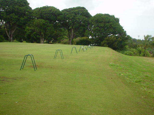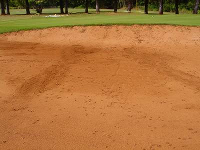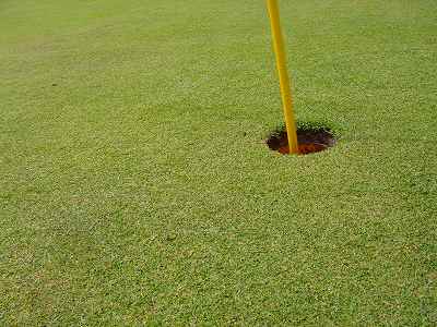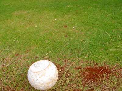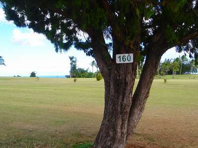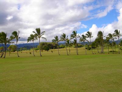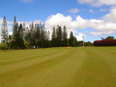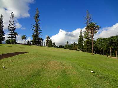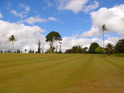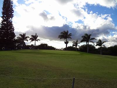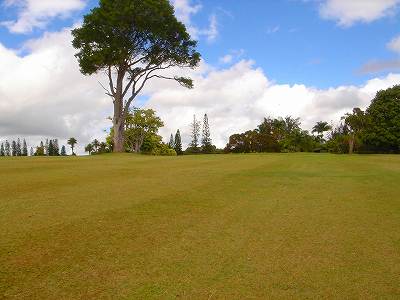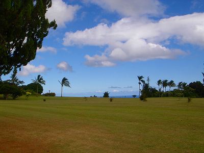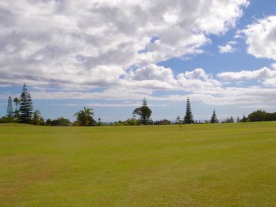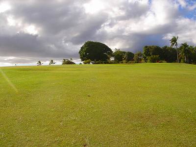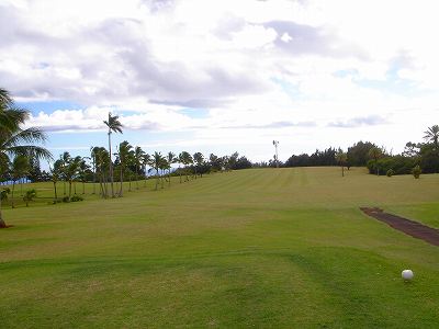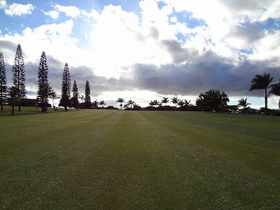 ■コース景観: ●コースから見たまわりの景観:B+ コースが、標高が少し高いところにあり、はるか遠くですが、多くのホールから海が見えます。 6〜7番ホールあたりからは、海が180度近く広がってみえて、けっこう絶景!(^^ ただ、もっと海の近くにあるコースと比べたら、それほどでもないので、”B+”としました。 このコースで、海が見えることなんて期待してないと、けっこう感動できる景観かも??? また、海と反対方向は、広々としていて、カウアイ島の山々が見えます。 ●コース自体の景観:D コース自体の景観は、池もなく、単調なので、たいして景観はよくありません!(^^; ココナッツツリーは、ところどころにありますが・・・。 ■コースコンディション:D+ コースコンディションは、全体的にはよくありません! ただ、グリーンの状態だけはよかったので、”D+”としました! ■フェアウェイ(キクユグラス?): D-元々は、全面バミューダグラスだったのでしょうか? 葉が太いので、ゾイシア(野芝)?か雑草みたいな草。 もしかしたら、キクユグラスかもしれません!? 密集度は少なく、フカフカ感はゼロ。 すぐ、下の地盤なので、はっきりいって硬いです。 とはいえ、泥が完全に露出したベアグランドは、それほど多くはなかったので、”E”ではなく、”D-”にしました。 ![]() このように、その草のほとんどが枯れて茶色くなっているようなところも多く、状態は、悪いです!! 真冬のコウライ芝のよう・・・!(^^; とても、ハワイとは思えない光景!(笑) ![]() ところどころに、このように、芝がヘゲてしまって泥が露出しているところもあります。→ ![]() 6番ホール(パー3)のティーグランドとグリーンの間付近にだけ、ちゃんとしたバミューダグラスが生えていました!→ ■グリーン(パスパラムグラス):B+ グリーンだけは、パスパラムグラスが貼ってあり、けっこういい状態でした!まあ、ところどころ、芝の密集度が少なく、そんなに良い状態というわけではありませんが、フェアウェイの状態と比べると、かなりいい状態なので驚きます!(笑) フェアウェイのメンテナンスは、まったくしていないような印象ですが、グリーンだけは、しっかりメンテナンスもしているみたい。 スピードはやや速めで、RYOの感覚では9フィートくらい。 ボールの転がりが非常によく、文句はありません!(^^ ■ティーインググランド(キクユグラス?):D ![]() ティーグランドも、フェアウェイと同様の、葉が太い草(キクユグラスかも?)のところがほとんどです!(^^; 密集度が少なく、泥が半分透けてみえるようなところが多く、”D”としました。 フカフカ感はゼロで、かなり硬いです。 硬くて、ティーがなかなか刺さらず、一苦労です!(^^; また、フラットでなく、けっこう傾斜していたり、デコボコしているところが多く、アドレスしづらかったです。 ![]() ところが・・・。 ティーグランドは、フェアウェイと違い、枯れて茶色になってないところが多く、このように、けっこう緑色でした!→ とはいっても、芝ではないですが・・・。(^^; ![]() 5番ホールのティーグランドだけ、パスパラムグラスでした!→ さすがに、パスパラムグラスは、緑の色が濃く、きれいにみえます! グリーンで余った種でもまいたのかな???(笑) ■ラフ(キクユグラス):D- ラフも、フェアウェイと同じ芝です。というか、ほとんどのところが、フェアウェイとラフの境界がなく、同じといえば同じです!(^^; なので、全体がラフというか、フェアウェイというか・・・!?(^^; ![]() ところどころに、草が長いところがあります。→ まあ、ほとんど雑草みたいな感じでしたが・・・。 ![]() グリーンの周辺だけは、パスパラムグラスの種をまいたのか?けっこう緑色をしていて、見栄えはきれいでした!→ ベアグランドのところも、けっこうありますが・・・。(^^; ■バンカー: バンカーの砂は、赤茶色。すぐ下が硬かったです!(^^; ■コースレイアウト:D 全体的に幅が広いホールが多く、プレーはしやすいです。 しかし、谷越えホールが1つあるものの、池はなく、レイアウトは単調で、おもしろいレイアウトではなく、”D”としました。 ■快適度:C コース自体はあまりおもしろくはないですが、意外にも、海が見えて、けっこう景観がいいホールがあるので、”C”としました。 料金が激安なことを考えると、お得感があり、ある意味、快適かも???(笑) ■コース難易度: 幅が広いホールが多いので、やややさしめです。 ただ、フェアウェイ(ラフ)が硬く、ある意味、難しいといえるかも???(^^; ■グリーン難易度: アンジュレーションはそれほどなく、難しくはありません。 ボールの転がりはよく、スピードはやや速いですが、普通くらいといったところでしょうか。 ■おすすめ度:C わざわざ、このコースまで行くことはおすすめしません!(^^; しかし、非常に料金が安いので、ポイプベイでプレーしたついでに、訪れるのはいいかも? どちらかというと、練習感覚というか、遊び感覚で、プレーするのがいいと