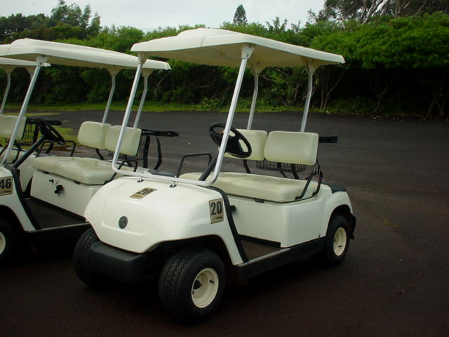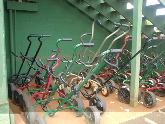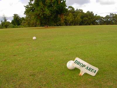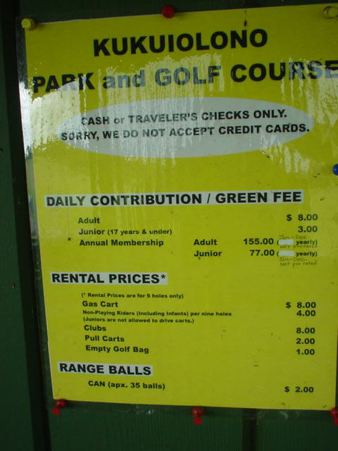 スタートオフィスのカウンター横に掲示されている料金表。→ 5年前より、グリーンフィー、カートフィーとも$1ずつ値上げされていました! ■距離表示 ![]() フェアウェイの脇に、小木で表示。→ グリーンセンターまで、残り100、150、200ヤード地点に、このような表示があったと思います。 実際、RYOはレーザースコープを使用しているため、あまり確認しませんでした!(^^; スプリンクラーヘッドの距離表示はナシ。 ![]() そのほか、大きめの木には、距離が表示されていたところあり。→ ピンポジション表はありません! ピンフラッグの色も全て同じ(黄色)だたと思うので、フラッグの色による前中奥の表示もなし。 ピンの上中下のプラスティックボールでの表示もなし。 ■ヤーデージブック なし。 ■アクセス 1996年のレポート↓をご覧ください。 ■クラブハウス ![]() 1996年に訪れた時と変わっていません! 丘の上に建っていて、木造の2階建て。→ かなりボロイです! パーキング側からは2階建てで、コース側からは丘を上ったところが2階になります。 チェックインは、2階のコース側にあるスタートオフィスカウンターで行います。 1996年のレポートもご覧ください! ■プロショップ 5年前は、スタートオフィスのすぐ脇にあったのですが、なくなったみたいでした!(^^; 1996年のレポートもご覧ください! ■レストラン クラブハウスの裏側にあったレストランもなくなっていた感じ・・・。 あまりよく確認しませんでしたが・・・。(^^; 1996年のレポートもご覧ください! ■スナックショップ レストラン内にスナックショップがあったのですが、ないかも??? 1996年のレポートもご覧ください! ■スナックカー なし。 ■ロッカールーム・ロッカー なし。 ■シャワールーム・シャワー なし。 ■風呂 なし。 ■レストルーム クラブハウス1階の裏手にあります。 暗くて、きれいでなはないです・・・。(^^; 1996年のレポートもご覧ください! ![]() コース内のレストルーム。→ かなりボロい小屋でした! あまりきれいではありません!(^^; ■スターターカウンター なし。 スタート管理は、スタートオフィスですべて行っています。 ■乗用カート 2人乗り乗用カート。 ガソリン式。カート使用時のサインはナシ。 (もしかしたらチェックイン時にサインしたかも???) けっこう古くてボロい。 ガソリン式なので、走行中もうるさいです! カートは、フェアウェイを自由に走行できます。 カートの前方のプラスチック板はナシ。 ![]() 前方下には、小物入れスペース、ドリンクホルダーあり。 スコアカード、ペンシルは、ハンドル部に装着されていました。 ティーペグなし。 タオルなし。 ![]() カート後部には、小物入れるカゴあり。 やや小さめです。 ディボットボトル、クーラーボックスの装備はありません! 手引きカートについては、1996年のレポートをご覧ください。 ■ドライビングレンジ あり。 有料です。 35球:$2 写真など詳細は、1996年のレポートをご覧ください! ■チッピングレンジ なし。 ■パッティング練習グリーン あり。 写真など詳細は、1996年のレポートをご覧ください! ■ボール洗い機 ![]() あり。 ティーグランドの脇にあります。→ 全ホールにあったか?は未確認。 ダストボックスも、いっしょにくっついています! ■その他の設備 その他の設備は、特になし! ■ティーマーク ![]() プラスティックのゴルフボール状のティーマーク。→ 9番ホールは埋め込みタイプだったと思います。 ■ピン・ピンフラッグ ![]() ピンの長さは、ちょっと長め。 35インチパター×2+グリップ+20センチ。 フラッグは黄色。 ホール番号が書いてあります! 1番ホールのフラッグ。→ たしかすべて黄色だったので、ピンポジション表示はなし。 ■ホールプレート なし。 ■バッグタグ なし。 5年前には販売していましたが、プロショップがなくなってたようなので、なくなったかな? ■プラスティックボールマーカー なし。 これも、5年前には販売していましたが、プロショップがなくなってたようなので、なくなったかな? ■日本語スタッフ いません!