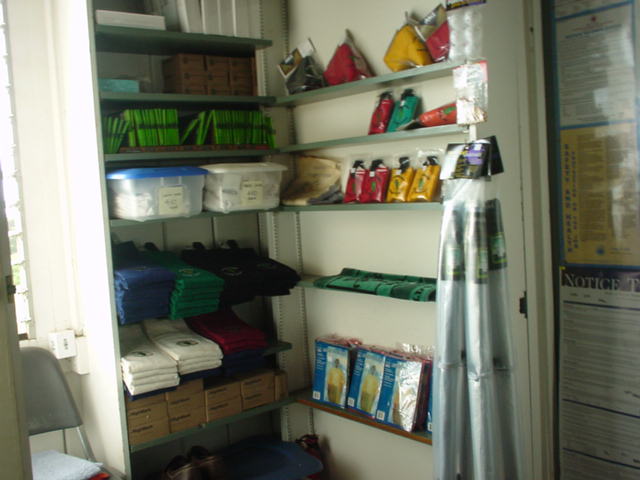 ■レンジボール(35球):$2 ■バッグタグ:$3 ■プラスティックボールマーカー(10コセット):$1 この日は、ウィークデーだったにもかかわらず、けっこう混んでいてビックリ!!(^^; ローカルの人たちで、賑わってしました! 到着順にチェックインし、スタートしてるみたい。 混み合っているときは、スターターはいないので、2階のチェックインカウンターから、アナウンスするようです。 RYOはこの日、ポイプベイでプレーの予定でしたが、疲労のため、ポイプでのプレーはパス! (友人だけ(3人)でプレーしてもらってました!) 18ホールは厳しくても、もしかしたら9ホールだけなら平気かと思って、このククイオロノでプレーする覚悟はあったのです。 ところが、取材をしているうちに、ものすごいスコールとなり、もうあっというまに、ものすごい豪雨に・・・!!! 慌てて、車の中に避難! ふと、”バッグドロップ”のところに、ゴルフバッグを降ろして、そのまま置きっぱなしにしていたことに気づいたのです。 しかも傘は、ゴルフバッグの中・・・。 取りに行く間もなく、ゴルフバッグは、ずぶ濡れになってしまい、地獄!!!(^^; まあ、傘があったとしても、無意味だったでしょうが・・・。 しかし、もしスタートしてたら、全身ズブ濡れになるところです! カートに乗っていても意味ナシというくらいの豪雨だったので、その時、プレーしていた人たちは、間違いなく悲惨なことになっていたことでしょう!?(^^; 30分くらい待つと、あっというまに、陽が射してきたのでした。(^^; 雨はやんだものの、これから9ホールプレーするかどうか・・・。 友人がポイプで18ホール終了する頃には戻らないといけないので、ちょっと微妙な時間に・・・。 疲労がかなりもあったのと、また豪雨になるかもしれないと思い、、プレーは断念したのでした・・・。(^^; まあ、プレーしなければ時間は、かなり余裕があるので、陽があたるところにゴルフバッグを置いて乾かしたら、けっこうすぐ乾いたのでした!(^^; |