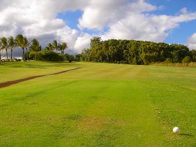 ※以下の距離は、スコアカードに記載の距離を掲載しています。 ただ、実際には、ブルーティー(バック)のティーマークは設置されていませんでした! また、ホワイトティーのティーマークの設置位置はスコアカード通りではなく、ホールによってブルーの位置に設定されていたと思われます。 そのほか、レッドティー(レディース)のティーマークもなかったような?気がします。 ![]() No.1 Par 4 ■333yard □321yard ■304yard スターティングホールは、左へカーブしているパー4。 グリーンまで、かるーく下っています。 右は外周でOBですが、ホールの幅は広いです! ティーグランドに立ってみての第1印象は・・・。 ”なんか、芝生があまり生えてないなぁ〜!” そう!ティーグランドの芝の密集度がやけに少なく、泥がかなり露出して感じになっていたのでした!(^^; ”この先のホールのコースコンディションも期待できないなぁ〜!”と、しょっぱなから思ってしまいました!(笑) ![]() 幅は広いので、ティーショットではドライバーで、思いっきり打っていけます! このホールはカーブしているものの、広いのでほとんどストレートと同じ感覚。 ←セカンドショット地点付近。 この先も幅は広いです! フェアウェイには、芝らしき草?が生えているものの、密集度は少なめ。 なにより、フカフカ感がゼロで、下がすぐ地盤。 そのため、非常に硬いです・・・!(^^; ![]() フェアウェイから右サイドを見たところ。 はるか彼方に、海が少し見えます! この写真では、ほとんどわかりませんが・・・。(^^; ![]() グリーンは、左右奥から、少しだけ砲台形。 グリーンの左右に、バンカーがあります。 ![]() ティーグランド、フェアウェイだけでなく、ラフの芝?の状態もひどいものでした!(^^; ところが・・・。 驚いたことに、グリーンだけパスパラムグラスを使用しており、けっこういいコンディションでビックリ! ボールの転がりもよかったです!(^^ ![]() No.2 Par 5 ■595yard □580yard ■550yard 1番ホールから、右方向へ向かっています。 右へカーブしているパー5。 途中までやや上りで、その先は下り。 右はOBですが、幅は広いです! ティーグランドのすぐ左前方に木が立っていて、ブッシュエリアがありますが、ショットにはほとんど影響ありません! このホールだけ、フェアウェイセンターにIPフラッグらしきものがありました! ![]() セカンドショット地点付近。 この少し先までやや上りなので、このあたりからグリーンは見えません! このホール、距離が非常に長いのですが、このコース、フェアウェイが硬いので、ランが非常にでて、けっこう飛びます!!(^^ ティーショットしたRYOのボールは、異常に飛びすぎていて、なかなか発見できませんでした!(^^; 自分の飛距離付近をさがしていたら、まったく見つからずにロストかと思ったら、かなり先にあり、ビックリ! 280ヤードくらいは飛んでいたかも???(笑) ![]() 下り傾斜がはじまる地点付近。 この先、グリーンまでダウンスロープです。 それより、このフェアウェイをご覧ください! これって、泥ではないのですが、フェアウェイの芝?がほとんど枯れた状態になっていて、冬のコウライ芝でプレーしているみたいで、ハワイとはとても思えませんでした!(^^; ![]() フェアウェイから左サイドを見ると、はるか彼方に海が少し見えました! その手前は、となりの3番ホールです。 ![]() サードショット地点付近。 グリーンは左と奥から砲台形です。 グリーン左にバンカーあり。 ![]() No.3 Par 4 ■400yard □330yard ■274yard やや左カーブしているパー4。 距離は短めで、幅は広いです。 ティーグランドの前が少し低くなっていて、その先はやや上りです。 右サイドと後方はるか彼方に海が少し見えます。 ←ティーグランドの少し前方から見たところ。 ![]() セカンドショット地点付近。 この先、かるーく上り。 グリーンは砲台形。 バンカーはなかったような??? ![]() No.4 Par 4 (■Par 5) ■425yard □414yard ■400yard ストレートのパー4。レディース(レッドティー)はパー5です。 ティーグランドがちょっとだけ高くなっていて、その先は途中まで上りで、その先、今度は下りになっています。 幅は広いです。 ![]() 左サイド遠くには海が見えます! おっ!?だんだん海に近づいてきて、意外といい景色???(笑) ![]() セカンドショット地点付近。 この少し先まで上りで、ここからだとグリーン見えず! その先は下り。 奥には、鉄塔が立っています! ![]() グリーンの左手前から見たところ。 鉄塔には円形のものが装着されていて、パラボラアンテナかん??? 実際には、何なのか?不明・・・。 ![]() No.5 Par 4 ■293yard □282yard ■227yard ストレートのパー4。 ティーグランドのすぐ前が窪みになっていますが、その先はやや上り。 幅は広いです! ![]() ここのティーグランドだけ、パスパラムグラスで、緑の色濃くきれいでした! ただ、端の方は泥が露出していましたが・・・。(^^; ![]() ←ティーグランド前にある窪みの右の方は、ブッシュです。 まあ、よほどのチョロで