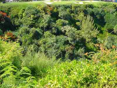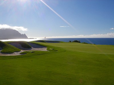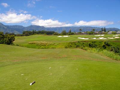 No.1 Par 4 ■432yard ■410yard □367yard ■385yard ![]() ![]() 右へカーブしているパー4。 幅は広いですが、左右にグニャグニャ形のフェアウェイバンカーがあります。 左サイドはコース外(住宅)でOBですが、気になりません! フェアウェイは、最初はフラットで、途中からかるく下っています。 このホール、メンテナンス中なのかわかりませんが、何故か?カートでのフェアウェイ走行禁止ホールでした! ![]() ![]() セカンドショット地点付近。 カーブを曲がったあたりです。 グリーンは、左右奥から砲台形で、グリーン右にバンカーがあります。 以前のレイアウトとは、グリーンが砲台形になり、バンカーの位置と形状が変わっています。 ![]() ![]() ![]() だいたいストレートのパー5。 フェアウェイはややダウンスロープで、幅は広め。 左はOBで、右はとなりのホール(5番ホール)。 左右のフェアウェイバンカーがけっこう効いています。 ![]() 左サイドは住宅でOBです。 ![]() セカンドショット地点付近。 この先も、かるいダウンスロープです。 ![]() フェアウェイ右サイドには、フェアウェイバンカーあり。 このあたりからだと、なんかこの先バンカーだらけのように見えるのですが・・・。 ![]() ![]() サードショット地点付近。 この先も、ダウンスロープ。 この写真だと、手前のグニャグニャ形バンカーは、グリーン手前にあり、グリーンがバンカーに囲まれているように見えるのですが・・・。 実は、この手前のグニャグニャ形バンカーは、フェアウェイにあるバンカーなのです。グリーン手前167ヤードの地点。 フェアウェイの左半分くらいが、マウンドのように盛り上がっていて、その中にバンカーが造られています。 バンカー奥が高くなっていて、その先が下りなので、視覚的にグリーンすぐ手前にあるバンカーのように見えるというわけ! ![]() 上写真のバンカーの先から撮影。 グリーンはやや砲台形で、ガードバンカーがあるのは左右奥で、手前には花道があったのでした! グリーン奥には、早くも海が見えてきます!(^^ 仲間の1人は、水面が左にちょっと見えるだけで、奥に陸地(岬)があり、水面の右はホテルが立っていて、視界がさえぎられているので、海だとは思わず、レイク(湖)だと思ったようです。 ![]() 奥に見える巨大ホテルは、このプリンスビルリゾートのメインホテルである「セントレジス・プリンスビルリゾートホテル。」 ハナレイベイのオーシャンフロントに建てられています。 ![]() グリーン左から撮影。 ![]() ![]() 3番ホールは、ものすごい打ち降ろしで池越えのパー3。 ティーグランドが高いところにあり、グリーン面は、かなり下の段にあります。 ティーマークの少し少し後方から撮影した左写真では、グリーン面がよく見えません! ![]() ←ホワイトティーの位置に立つと、こんな風に見えます。 下の段には池があって、グリーンは池の奥。 写真だと左ブッシュのすぐ右の前後のバンカーの間がグリーンで、グリーンは小さめ。 この日は、ピンまで135ヤードくらいでしたが、打ち下ろし分の距離換算と風の計算がポイント! グリーン右まで池で、前後のバンカーも視覚的プレッシャーをかけています。また、奥のバンカーを越えてしまうとOBなので、あまりデカ打つわけにもいきません! 奥には、海とホテルが一望できます! ![]() ティーグランドからかなり右前方を撮影。 奥の丘の上には、コンドミニアム?棟が、並んでいました! ![]() ドロップエリア。 2つ上写真の橋より10ヤードくらい右付近にあります。 池に落とした場合、1ペナでここにドロップ可能。 ![]() グリーン右の池のさらに右にある、4番ホールのブルーティーから撮影した3番グリーン。 ![]() グリーン奥は、深い谷になっていて、底はブッシュ! 細い橋がかかっていて、奥の住宅の方へ渡れるようになっています。 ゴルファーには、この橋は無関係。 ![]() ![]() ホール形状は逆「く」の字形で、かなり上りのパー4。 ブルーティーのティグランドから撮影。 ブルーティーのティーボックスは、3番ホールの池が食い込んでいる奥にあり、ティーショットは池越え。 池は15ヤードくらいなので、この池越えはショットには影響なし。 ![]() ホワイトティーから撮影。 幅はそこそこですが、ティーマークがかなり右方向を向いているので、ティーショットは右奥のブッシュに突っ込まないように注意が必要です。 左の山裾方向狙いでいいでしょう! このホールは傾斜がきついため、カートでフェアウェイ進入禁止ホール。 ![]() セカンドショット地点付近。 この先、さらに上り傾斜がきつくなり、グリーンは”城攻め”で、それに伴い手前から超砲台形です。 上り分の距離感がポイントになりますが、グリーン左右と手前にはグニャグニャ形バンカーが待ち構えていて、非常によく効いています。 ![]() バンカーは、こんな配置にあります。 ![]() フェアウェイ右サイドのカート道路右のブッシュ。 この中にボールが入ったら即ロストです。 ![]() グリーン右上から撮影。 フ