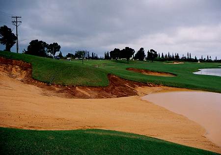 ![]() 4番ホールは右ドッグレッグのパー5。 セカンド地点あたりからグリーンにかけて、右サイドに巨大な池があるホールです。 ホワイトティーからは、右の池まで226ヤード。 ←ホワイトティーボックスから見たところ。 左サイドには、2つの大きなバンカー。 ![]() ←ホワイトティーボックスから望遠で撮影。 グリーンは、写真のいちばん右。 1つ目のバンカーまでは175ヤード、2つ目のバンカーまでは、228ヤード。 ![]() ティーショットで、池をさけて左へ打つと、ちょうどつかまる距離にあるので、よく考えて設計されています。 このクロスバンカーは、2つともけっこう深く、前方のアゴが高いので、もし入った場合は、脱出がやっとになることでしょう! ←前日の豪雨の影響で、バンカーには水がたまっていました!(^^; スタッフが、必死に給水作業してました。 ![]() ←右サイドの池の手前から見たところ。 フェアウェイは、右にカーブしているので、この写真で、グリーンは、ちょうど池の奥にあります。