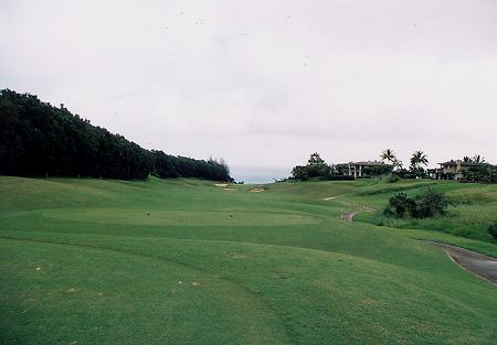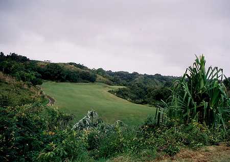 このコースのシグネチャーホール。 このホールのティーグランドにたどり着くと、驚くべき光景を見ることになります。 コース内で、いちばん標高の高いところにがあり、かなり遠くまで見渡すことができるのですが、眼下に広がるジャングルを目の当たりにして、”自分はとんでもないところでゴルフしているんだなぁ!!”と痛感することになるでしょう!?(^^; ![]() さて、みなさま!! ↑の写真をご覧になって、ティーショットを、いったい、どこへ打てばいいと思いますか??? ティーグランドからは、左方向には海が見えますが、大きく広がるジャングルの中に、わずかに見えるフェアウェイ。 ”おいおい!いったい、どこへ向かって打てばいいの???”と、思わず声がでてしまう、凄まじいホールなのです。(^^; 正解は?といいますと・・・。 実は、↑写真のいちばん右に見えるのが、この12番ホールのフェアウェイです。↓(その左に見えるフェアウェイは15番ホール。) ![]() ”え〜!!マジで???” そう、あまりにも狭く見えるのです!(^^; ジャングルの方がはるかに広い・・・! ティーグランドのすぐ前は、崖でジャングル。 フェアウェイは、ジャングルに囲まれた”アイランド”となっているわけです。 RYOは、今回で2回目のラウンドでしたが、2度目でも、”すさまじいホール”だと、あらためて思ったのでした! ティーショットは、ご覧のとおり、ジャングル越えで100フィートの高さからの、豪快な打ちおろし。 非常に狭いので、ドライバーを持つのは勇気がいりますが、意を決してドライバーでティーショット! ![]() RYOは、フェアウェイセンターに快心のドライバーショット!(^^ もう最高の気分でした!(^^ 前回はジャングルへ落としていただけに、喜びは格別! し・しかし、このホール、ボールのランディングがよく見えないのでした!(^^; ”おいおい、快心のティーショットを打って、まさかロストにならないだろうなぁ!?”と、ハラハラしながら、カートで下まで降りていきます。 ←カートで半分くらいまで降りてきた、”プリンセスティー(レッド)”付近から見たところ。 ![]() ←フェアウェイの右のラフから見たところ。 フェアウェイの段まで降りてくると、ボールは、フェアウェイ右サイドギリギリに発見!! それだけで、けっこう、うれしかったRYOでした!(^^ グリーンまわりはジャングル、そしてクリークがグリーン右脇にあり、セカンド地点からも、かなり狭くみえます。 ![]() ところが・・・、この先がまた難関なのです。 このホールのグリーンは非常に小さく、グリーンまわりはジャングル、グリーン手前にはクリークが食いこんでいます。 さらに、このクリークは、グリーンを囲むように、右から奥、左にかけて続いていて、グリーンを一段と狭く感じさせています。 花道は、左手前にありますが、右のクリークへ向かって、かなり傾斜していて、あまりに狭い!! さらにフェアウェイのスロープがきつい! RYOのボールは、せっかくフェアウェイにあったものの、運悪く、DIVOT!に入っていたのでした!(^^; セカンドショットは、安全にグリーン左手前にレイアップするはめに・・。 結局ダボになりましたが、ティーショットが快心だったので、けっこう満足!(^^ ![]() ←グリーン右手前のクリーク。 のぞきこんで見ると、けっこう深くなっています。 クリークの手前に、ドロップしたRYOでしたが、これも、かなりのスロープからで、アプローチはやさしくはありません! また今度きたときは、このホールでパーをとるぞ!!と、リベンジを誓ったRYOでした!(^^;