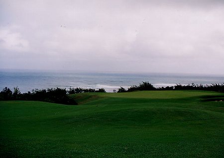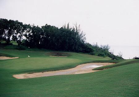 ![]() ストレートで、ゆるやかに打ち下ろしのパー4。 正面奥には海が見え、プリンスコースでは、いちばん海に近いホール。 右サイドは、やや広いですが、左サイドはブッシュが迫っています。 ![]() フェアウェイの右サイドには、クロスバンカーが2つ。 ホワイトティーから、218ヤードのところに1つ、その先に1つあります。 また、グリーンは、6コのバンカーにガッチリ囲まれています。 そのほか、左手前には、大きなグラスバンカー。 ![]() ←グリーンの右手前から見たところ。 写真の右奥が海。 とはいえ、グリーンの奥を、のぞきこんだら、すぐ海というわけではなく、少し離れています。