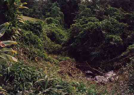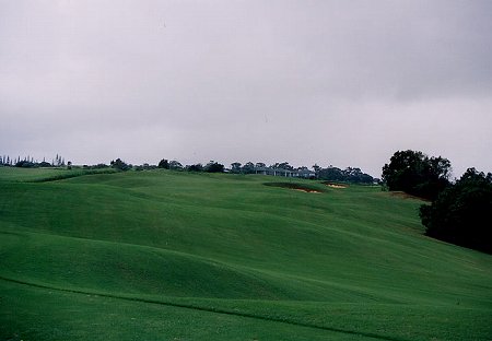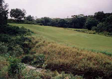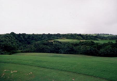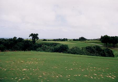 ![]() 2番ホールは、右ドッグレッグのパー5。 このホールがまた、とんでもなく難しいホールの1つです!(^^; セカンドショット地点の先で、大きな谷が横切っているのです。 この谷が、左奥へ向かって斜めに横切っているのが、また、たちが悪い!(^^; 谷自体の幅は、いちばん短いところで50ヤードくらいなのですが、ボールのポジションによっては、100ヤードくらいあります。 ![]() 問題なのはティーショットでのポジションで、ティーショットでは、左サイドは狭く、右は広くなっています。 谷の最短となるのは、左奥いっぱいなので、右に打つと安全ですが、セカンドでは230ヤード以上残り、谷越えは不可能となります。 ALIIティー(ホワイト)からセンター左へ約250ヤードくらい打つと、スロープを利用して、左奥へのベストポジションとなります。 ←セカンドショット地点付近、谷の手前から見たところ。 ![]() RYOは、快心のティーショットで、ややドローぎみでセンターへ。 そのスロープで最高のポジションへ!(^^ 前回は、右サイドへ打ち、谷の手前にレイアップしていたので、今回は理想のポジション!(^^ セカンドで谷越え自体は150yくらいでしたが、入れ込みすぎで力んでしまい、4アイアンでのセカンドが谷底へ・・・!トホホ・・・(^^; せっかく快心のティーショットだったのに・・・!(^^; 打ち直しのショットは、谷をクリアしたものの、あーーーーーーあ! またまた玉砕したのでした!(^^;