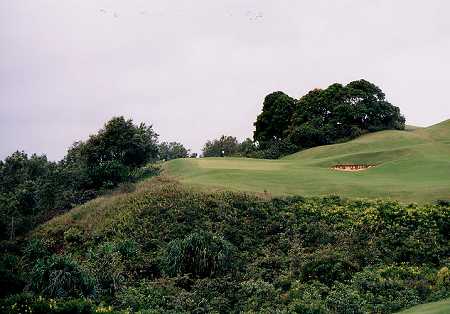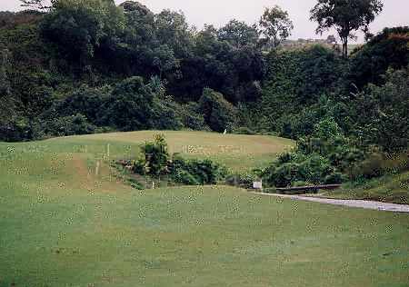 ![]() 谷(ジャングル)越えのパー3。 グリーン左はすぐ崖なので、右サイドが安全です。 ←ホワイトティーのティーボックスから見たところ。 ブルーティー、ブラックティーは、左後方にあり、さらに谷(ジャングル)越えとなります。
