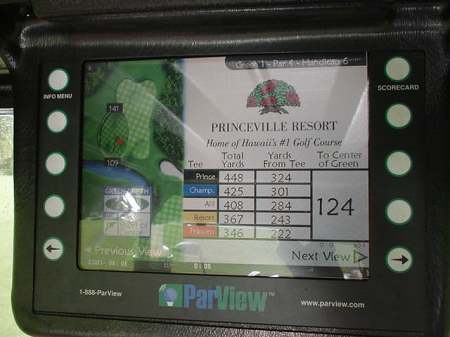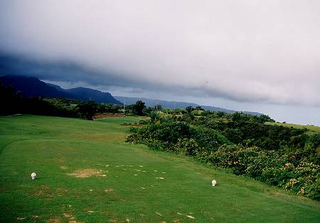 MENSレギュラーである、ALIIティー(ホワイト)からでも、たっぷり距離があります! この日は、日本人の年配の夫妻とのジョイント。 今回もRYOはALIIティー(ホワイト)からラウンドしました! このコースの特長は、まず、距離が長く、谷越えも多く、ブッシュやジャングルに囲まれていて、コースレイアウトが、ただでさえ難しいこと。 OBの ”stake(杭)”もあまり、見当りません! つまり、谷やブッシュに入ったボールは、ロストボールとなるわけで、打ち直しとなります。 ドロップエリアは、たしか、なかったと思います。 そして、より、このコースの難易度を高めているのは、フェアウェイのスロープ(傾斜)が、かなりあることなのです!(^^; フェアウェイにボールを運んでも、かなりのうねりがあり、ダウンスロープ、アップヒル、サイドヒル、またそれらの複合のライとなるため、ティーショット以外で、フラットなライから打てるところは、ほとんどないといってもいいでしょう!(^^; さらに、このプリンスヴィルエリアは、雨が多い地域であるため、ライが ”wetty(濡れている)”であることが多いのです。 ”wetty”な状態というのは、カジュアルウォーターか、カジュアルウォーターにならないギリギリくらいの状態!といった感じ。 カジュアルウォーターの救済を受けるとしても、どこにドロップしても、ほとんど同じ状態なので、結局はそのままショットするはめになります。 このような、スロープ&”wetty”からのショットが、このコースの難しさを倍増させているといえます!(^^; さらに、難しいことに、”谷越え”は、セカンドショットやサードショットなどのホールの途中にあることです。 ”谷越え”の幅自体は100ヤード程度であったとしても、ティーショットやレイアップしたショットが、谷の手前ギリギリでボールが止まったり、ギリギリに止めるショットを打てないからです。 たとえば、ボールのポジションが、谷の手前50ヤードくらいあれば、150ヤード以上のキャリーが必要な”谷越えショット”を打たなければなりません。(150ヤードのショットではギリギリで越えることになるので、実際には160ヤード以上。) そして、その”谷越え”はすべて、スロープ&”wetty” からのショットとなるため、150ヤードといえども、容易ではないのです。 ダウンヒル(左足下がり)でサイドヒル(つま先上がり)といった複合したスロープのライからの150ヤードの”谷越えショット”は、いいスイングするだけでなく、視覚的プレッシャーにより、力みやすく、ほんとに難しいのです。 谷に落ちてしまったら”ロストボール”なので、何度も打ち直すことになり、スコアが”雪だるま状”になってしまうことも充分にあることでしょう!(^^; スイング技術だけでなく、ほかにも、そのようなライからの正確性や方向性、また、自分の力量と向き合って、どのように攻めていけばいいかを考える戦略性、さらに、冷静な判断力、ロストボールになったとしても、落ち込んだり、くさったりしない精神力などが要求され、”運”を含めて、”自分のゴルフをすべて試されるようなコース”というように思えるRYOでした!(^^; ![]() さらに、このコースのラフの芝は、”モンドグラス”という、太さが1センチくらある芝?で、とても"芝”の種類とは思えないものです。→ この芝は、日本では経験することのないものなので、ラフに入ると、脱出がたいへんなことはいうまでもないでしょう! この太い芝は、非常に硬くて強く、クラブを振り抜かせてくれないわけです。(^^; ![]() また、どうみても”雑草”というような草のラフもあります。→ コースコンディションですが、フェアウェイ、グリーン、ティーグランドはバミューダグラスで、こんな雨の多いエリアなのにもかかわらず、非常によくメンテナンスされています。 ”wetty”な状態が多いですが、芝の状態としては、けっこういいといえます。 ほとんどコース内は”wetty” であるため、カートでフェアウェイを走行することはできません。 すべてカートパス(カート道路)を走行することになります。