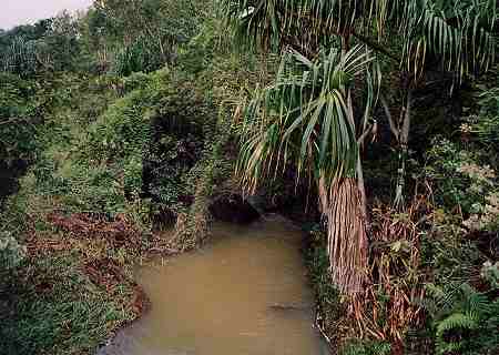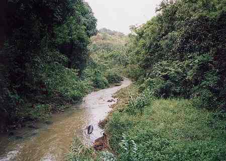 ![]() スターティングホールは、やや打ち下ろしのパー4。 ALIIティーからで、408ヤード。 形状は、逆S字形。 ティーグランドにたつと、いきなり、”うっ!狭い!!”と、驚いてしまいます!(^^; かなりプレッシャーがかかる、タフなホールです。(^^; ティーショットでは、右サイドのブッシュエリア(入ったらロスト)が近く、ホールの幅は非常に狭くなっています。 さらに、逆S字形になっているので、ティーショットで、真っ直ぐ打ってしまうと、奥のブッシュまで突き抜けてしまう可能性もあり、ドライバーを手にするのは、けっこう勇気がいるホールです。 ![]() さらに、難関がもう1つ。 ホール形状が、最後に左へ曲がっていて、セカンドショットは、”谷越え”。 グリーンのすぐ手前から左奥が谷になっていて、底にはクリーク(天然の川)が流れています。 この谷自体は小さく、深くはないのですが、ティーショットでいいポジションまで運んでいないと、2オンするには、かなりきびしい距離が残ります。 そのため、たとえティーショットがよかったとしても、残り距離やライによって、セカンドショットで2オンを狙うか、レイアップするかを選択する必要があります。 ![]() ←グリーン手前から奥へと流れているクリーク。 激しい雨が降った後なので、水は濁った濁流となっていました!(^^; 前回も、こんなでしたので、きれいな水が流れていることなんて、ないのかも??? 今回、到着してすぐのティータイムとなってしまい、ウォームアップもせず、いきなりのスタートとなってしまったRYOは、勇気をもってドライバーでティーショット。 まずまずのショットだったのですが、右サイドギリギリでブッシュに入ってしまい、打ち直し。 さらにそのあと、グリーン手前の谷にも落として、いきなり玉砕!(^^; やはりこのコースは強引な攻めは禁物! ていねいにレイアップしていかないと・・・と痛感したのでした!(^^;