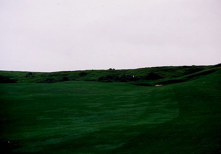 ![]() 残りの3ホールは、おだやかなホールになります。 16番は、左へカーブしていて、やや打ち上げのパー4。 これまでのすさまじいホールに比べて、幅もけっこう広いので、ようやく、なんかホッとする感じです!(^^ ←セカンドショット地点付近から。 グリーンは、バンカーの奥に見えます。