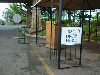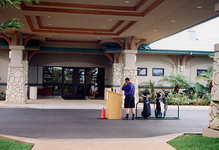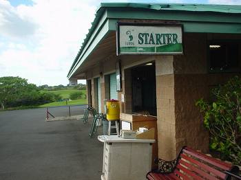 このコースでは、コースに到着したら、エントランス(クラブハウス正面入り口前)にスターターが待機しているので、そこでキャディーバッグを降ろすようになっています。