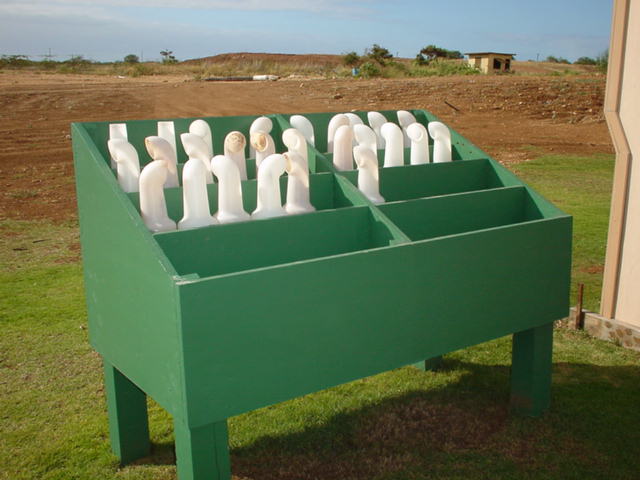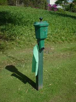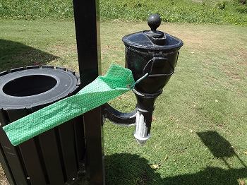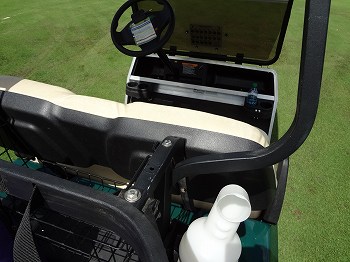 いくつかのホールのティーグランドに、交換用ボトルがたくさんおいてあります。