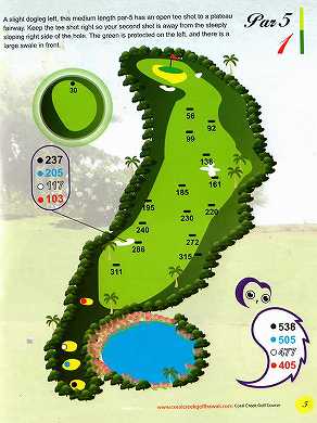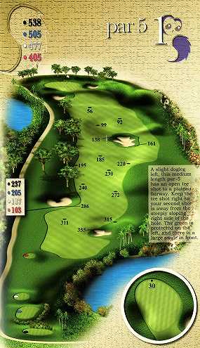 ※2000年のヤーデージブックには、池越えになっていて、右から小さな滝が流れ込んだイラストになっています。