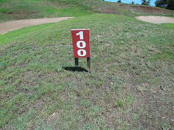 カートパスに表示。青:200ヤード、白:150ヤード、赤:100ヤード。