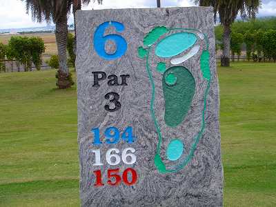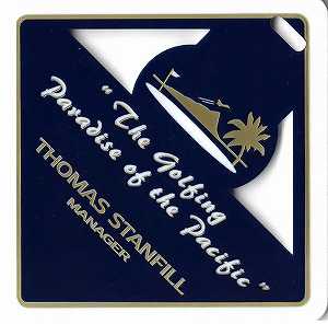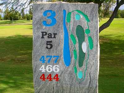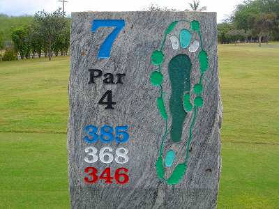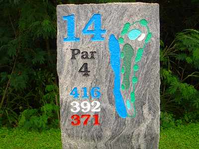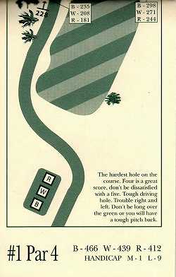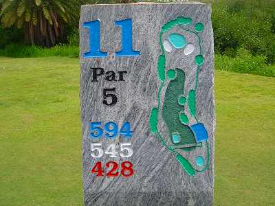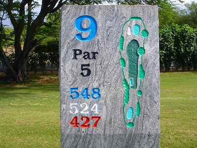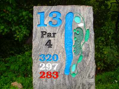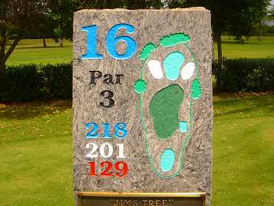 ホール番号と、それぞれのティーマークからの距離、パー、そして、簡単なレイアウト図が刻まれています。