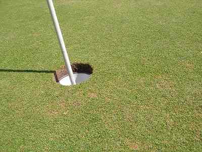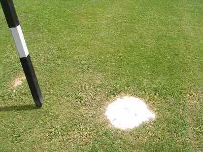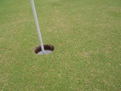 いくつかのグリーンで見られた、芝が茶色く枯れたようになっていて、泥っぽくなっていたところ。→