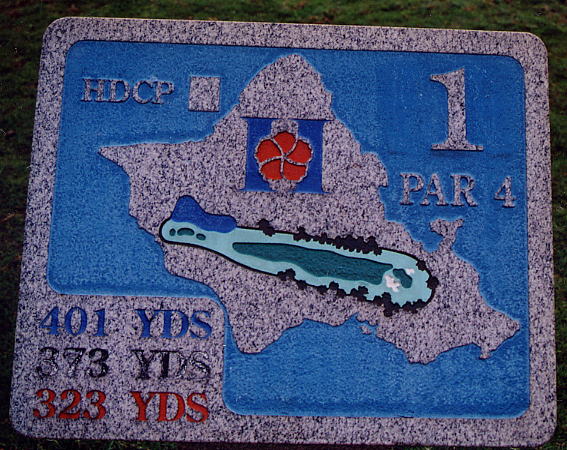 各ホールのティーグランドには、”花崗岩”製のホールプレートがたっていて、ホールナンバー、距離(ここには3つのみ表示)、簡単なレイアウトなどが記載されています。