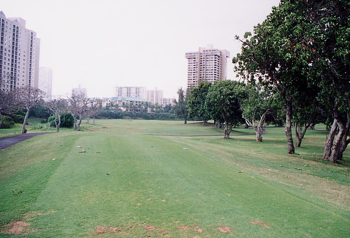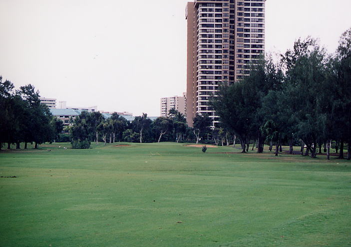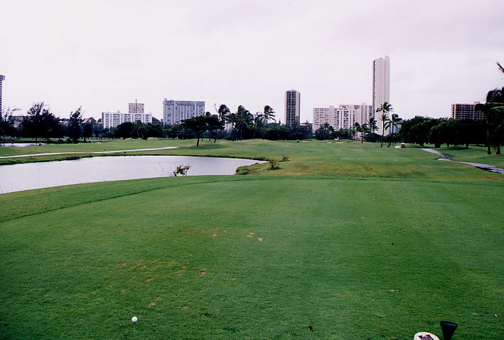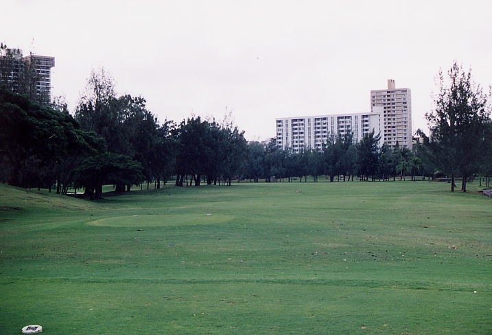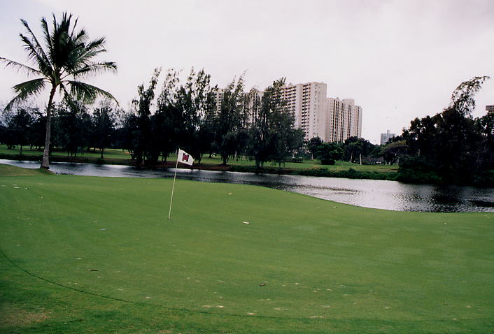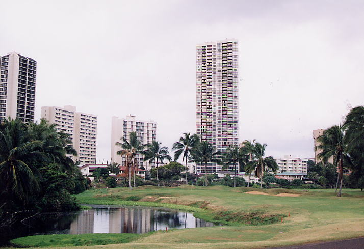 コースのまわりには、ホノルル市街の高層マンションのビル群(ハワイでは”マンション”という呼び方するのかな???)や民家が建ち並び、なんとも不思議な雰囲気。