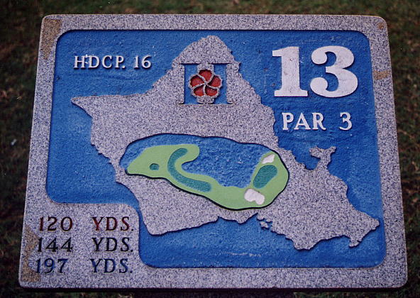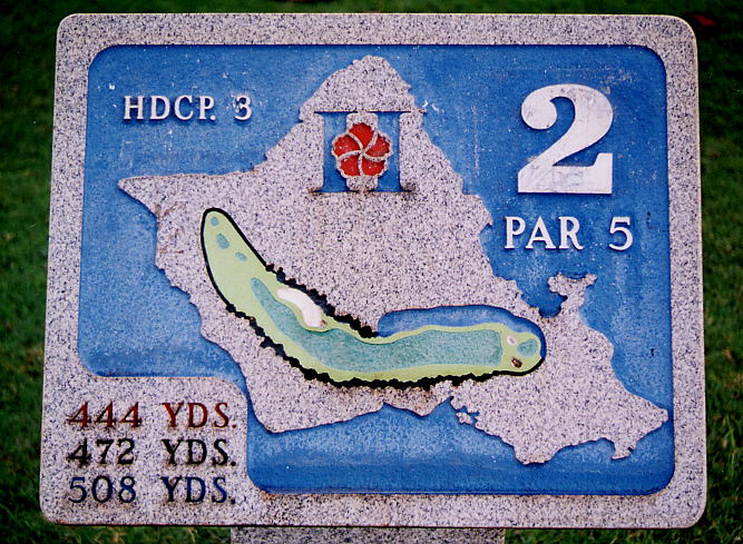 オアフ島の形状に図柄の上に、ロゴマーク、ホール番号、各ティーからの距離、パーが表示されています。