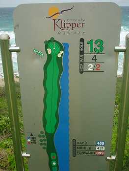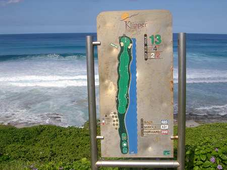 ときどき曇りだった天気は、シグネチャーホールの13番ホールでは、ちょうど陽が射して、海の色もきれいに見えたのでグッド!(^^