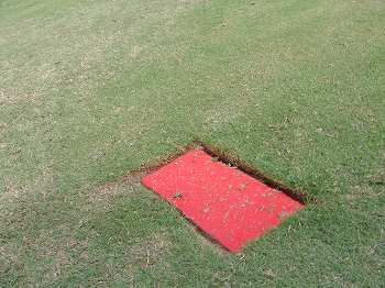 フェアウェイセンターに100(赤)、150(白)、200(青)ヤードの埋め込みプレート。