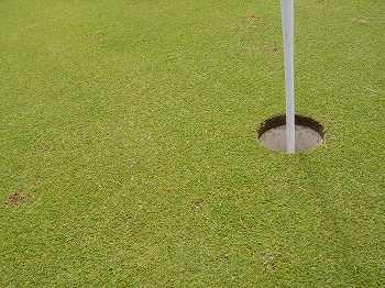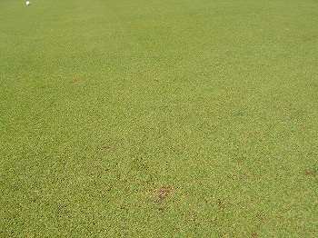 グリーンのところどころに雑草(太い葉の草)が生えているところもあり、グリーン表面は、けっこうデコボコで、ボールの転がりはあまり滑らかではなく、ボールが少し跳ねたり、急にスピードが変わったり、曲がったりと、今一つ。