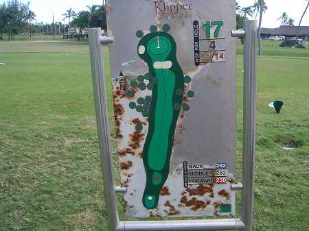 ゴルフコースのクラブハウス前にある「コースプレート」。→